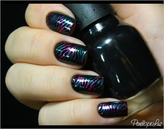 Achei que ficou tão lindo! Coloquei umas gotinhas espalhadas dos dois esmaltes, raspei e carimbei normalmente.