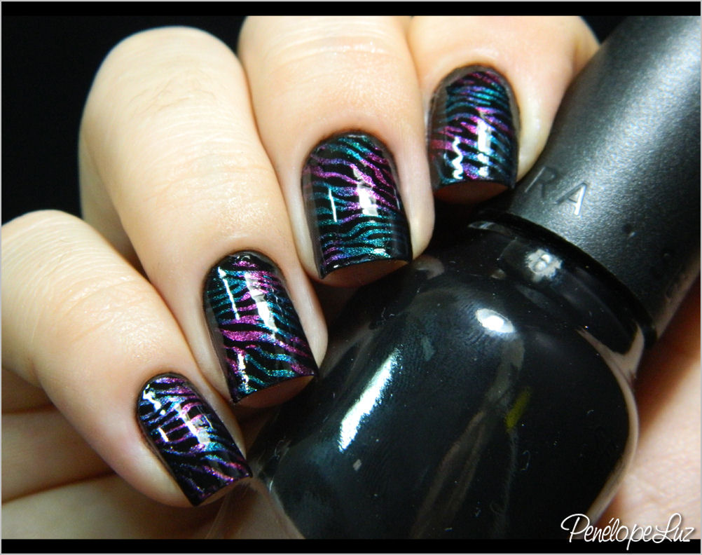 Achei que ficou tão lindo! Coloquei umas gotinhas espalhadas dos dois esmaltes, raspei e carimbei normalmente.