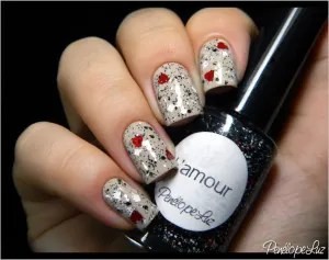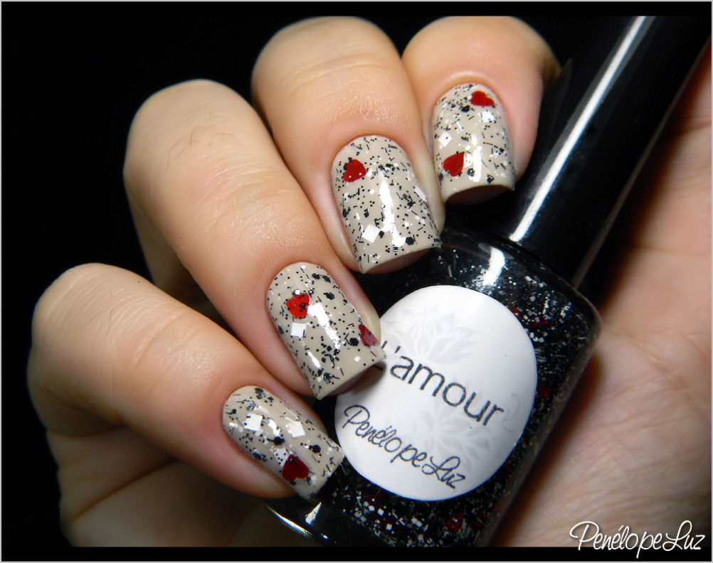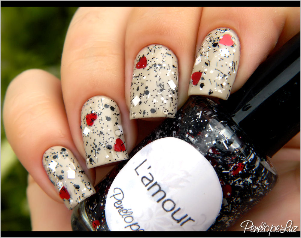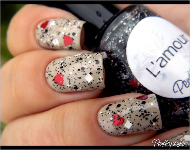 Depois do descanso do fim-de-semana, apresento para vocês mais uma das novas cores. Dessa vez o L’amour, que é uma mistura mais delicada de glitters pretos e brancos, junto com os corações vermelhos. 🙂