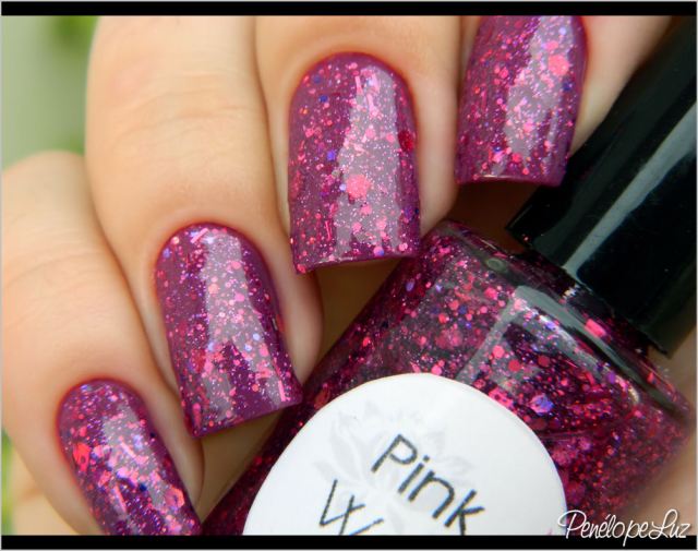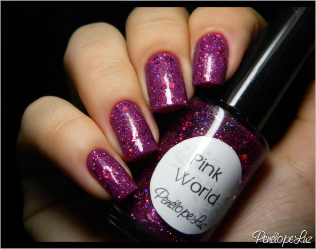O que acham do Pink World? São vários tamanhos e tipos de glitter holográfico rosa e um leve toque de roxo. A base é transparente para que possa ser usado sobre vários tons claros e escuros. Aí na foto tem duas camadas dele sobre o Pamplona Purple da OPI. Ele brilha muuuuuito! 🙂