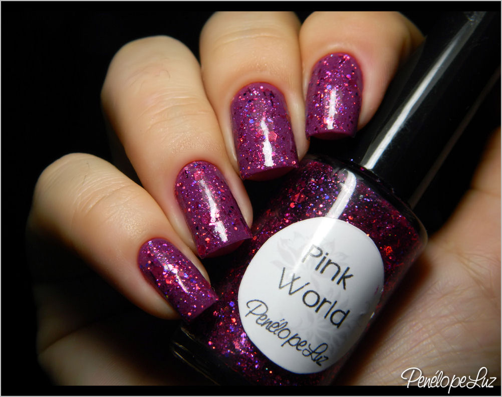 O que acham do Pink World? São vários tamanhos e tipos de glitter holográfico rosa e um leve toque de roxo. A base é transparente para que possa ser usado sobre vários tons claros e escuros. Aí na foto tem duas camadas dele sobre o Pamplona Purple da OPI. Ele brilha muuuuuito! 🙂