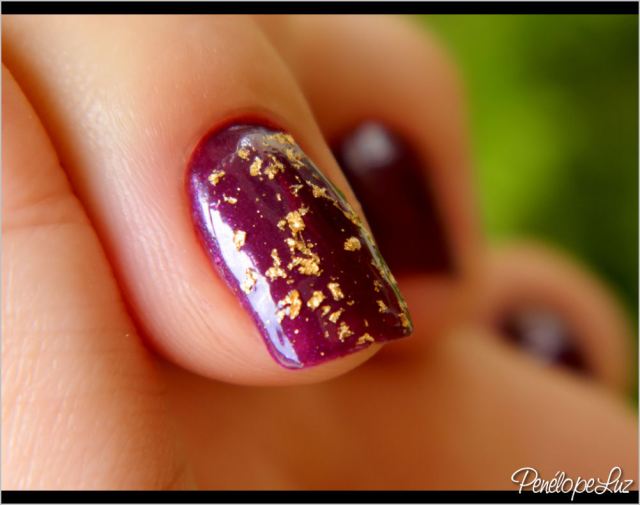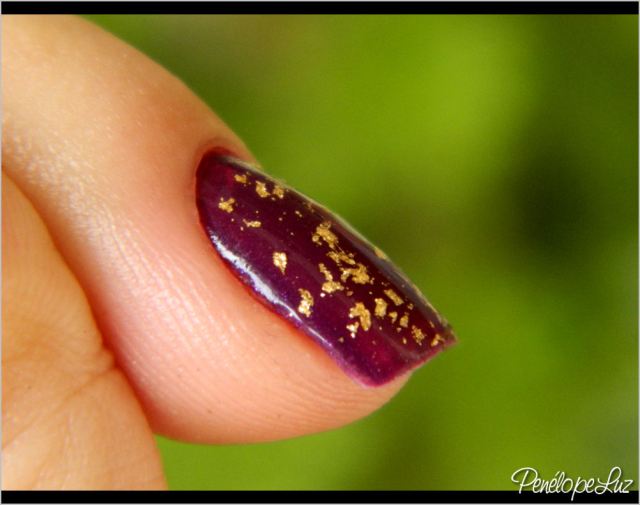 Primeiro deixa eu começar a falar com vocês sobre o material utilizado nesse esmalte, a folha de ouro. A loja que vende para mim esse material, me informou que tem uma porcentagem de ouro verdadeiro na composição da folha, mas obviamente não é ouro puro. Se fosse, ia custar uma fortuna, imaginem! Junto com o ouro há material oxidável, por isso é um material delicado e que deve ser usado com cuidado. Não pode colocar acetona dentro do vidrinho (isso vai deixar preto na hora, tal qual sua bijuox ficaria preta se você mergulhasse na acetona), não pode colocar diluente, tem que lembrar que é um material delicado.