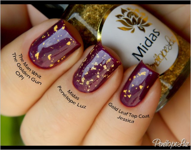 Agora a comparação com o The Man With the Golden Gun da OPI e com o Gold Leaf Top Coat da Jessica. Todos estão com uma camada sobre o Louvre Me, Louvre Me Not da OPI: