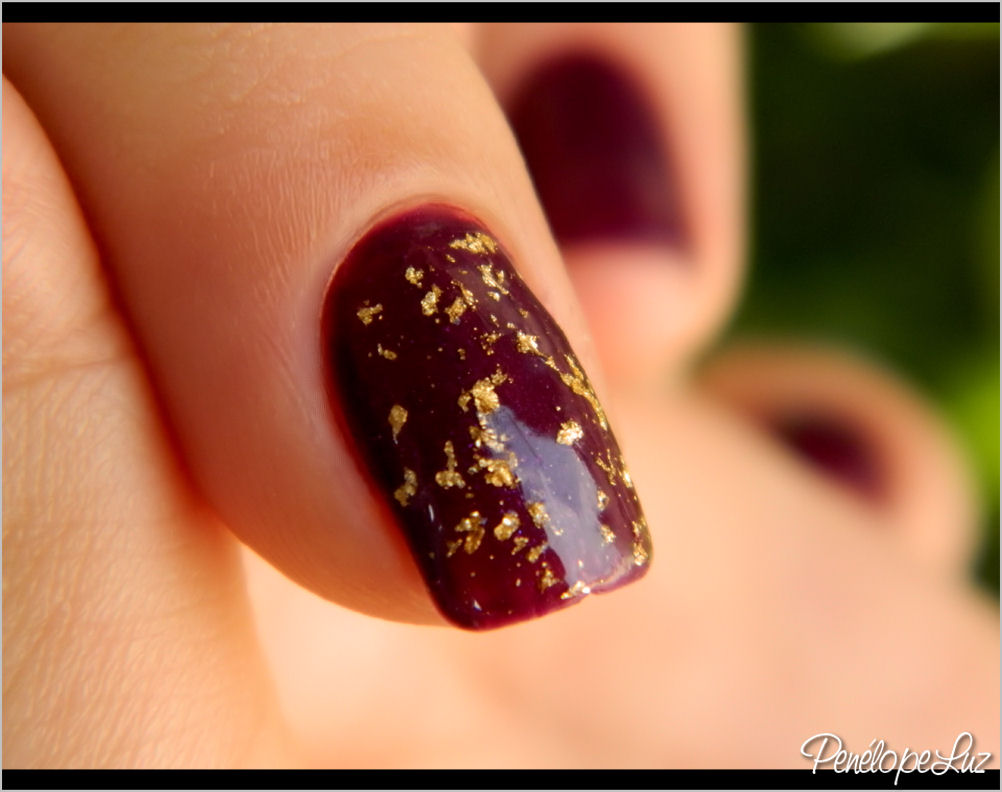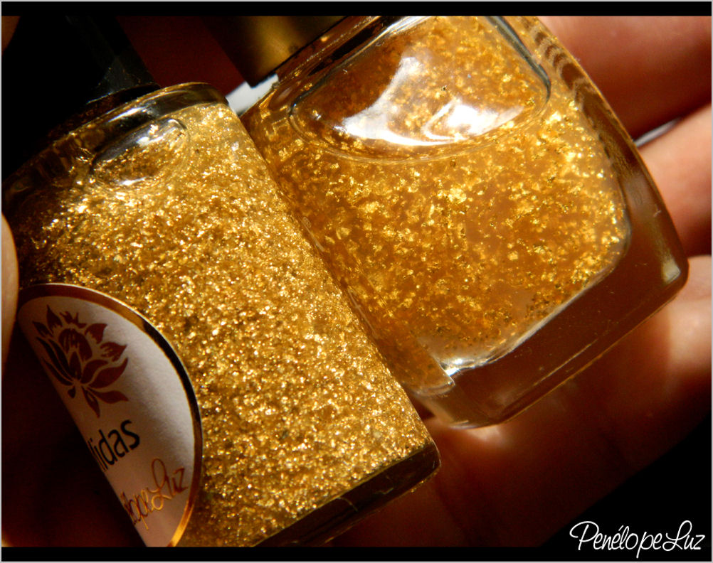 Primeiro deixa eu começar a falar com vocês sobre o material utilizado nesse esmalte, a folha de ouro. A loja que vende para mim esse material, me informou que tem uma porcentagem de ouro verdadeiro na composição da folha, mas obviamente não é ouro puro. Se fosse, ia custar uma fortuna, imaginem! Junto com o ouro há material oxidável, por isso é um material delicado e que deve ser usado com cuidado. Não pode colocar acetona dentro do vidrinho (isso vai deixar preto na hora, tal qual sua bijuox ficaria preta se você mergulhasse na acetona), não pode colocar diluente, tem que lembrar que é um material delicado.
