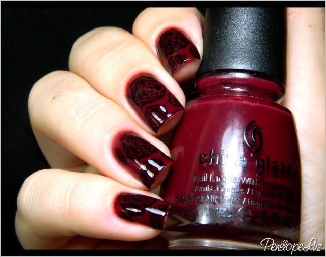 Lindo esse carimbo, né? Adorei e já estou pensando em outras combinações para ele! Adoro também esse vermelho da China Glaze, eu que adoro vermelhos em tons mais escuros, fiquei encantada por esse e já passa a ser um dos meus favoritos!
