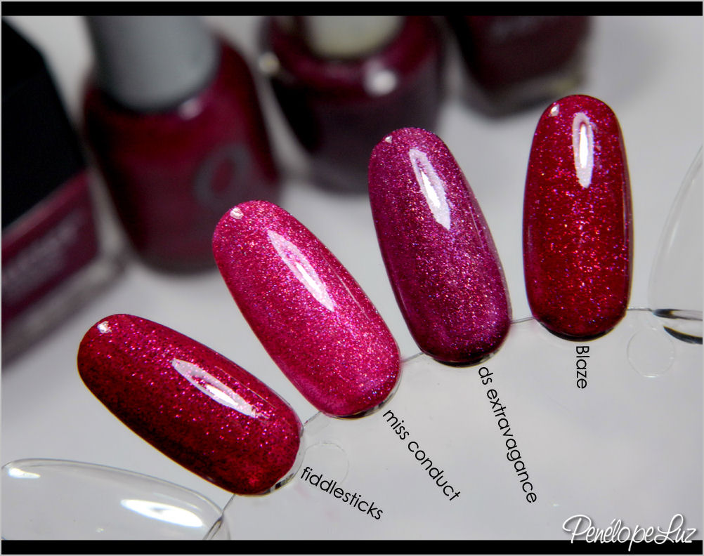 Não tenho outro glitter parecido com ele, os únicos que se parecem mais em termos de cor, são alguns que tem o mesmo acabamento do DS extravagance, aquela pasta holográfica mais grosseira. Fiz uma comparação para vocês verem a semelhança nas cores: