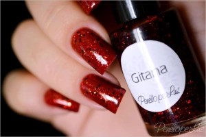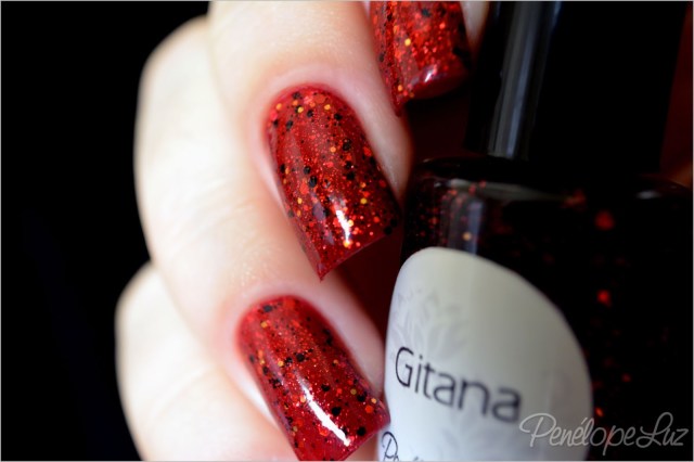 O Gitana tem glitters vermelhos holográficos, vermelho metálico comum, preto e dourado, de vários e vários tamanhos, então fica com bastante profundidade! Não é à toa que um dos PL que mais vendo, até quem não curte esmalte vermelho, gosta dele. Amém pra Fada dos Cosméticos! 😛