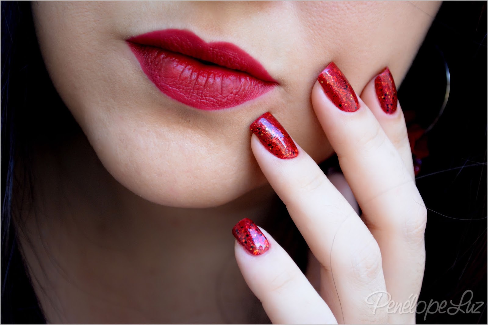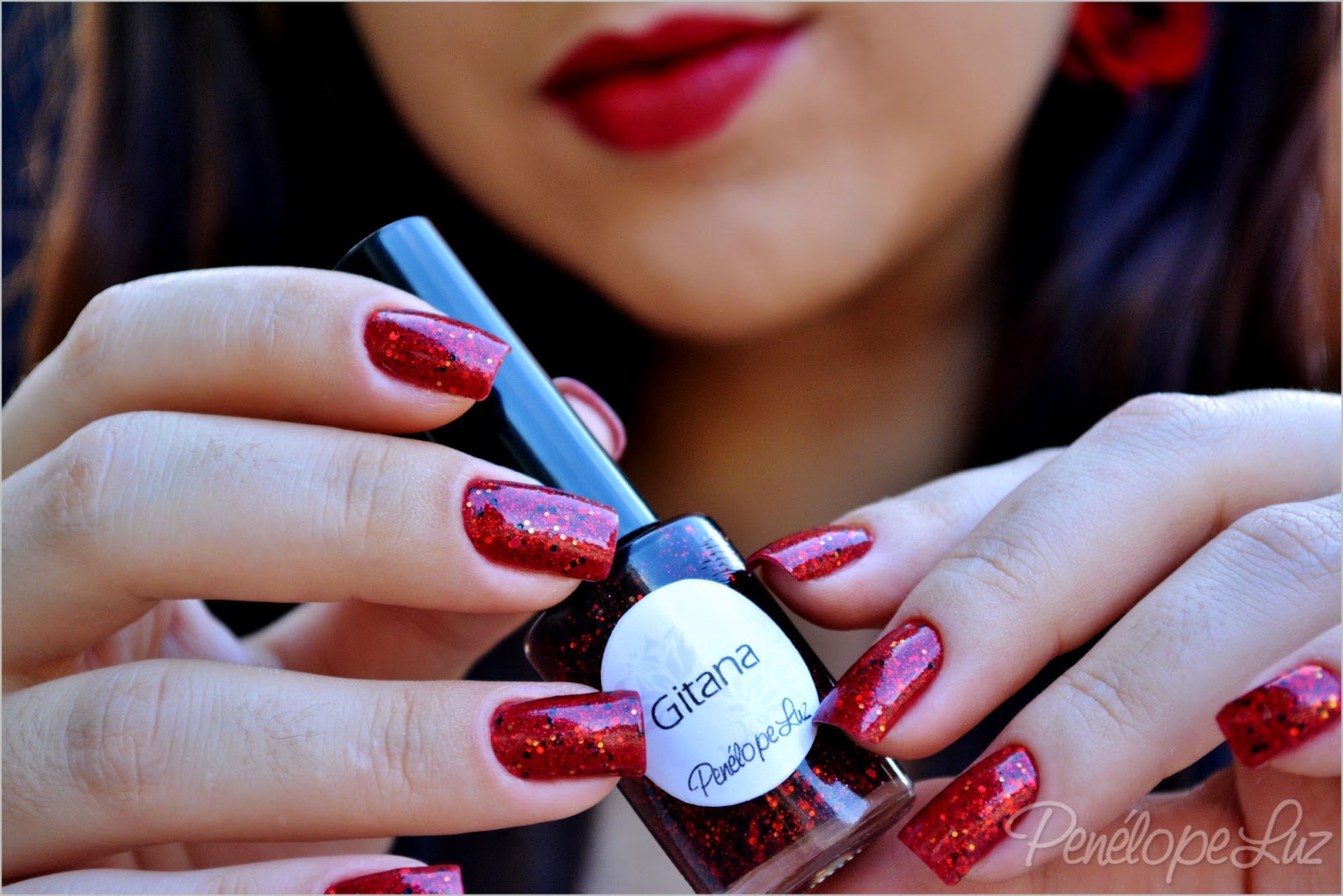 O Gitana tem glitters vermelhos holográficos, vermelho metálico comum, preto e dourado, de vários e vários tamanhos, então fica com bastante profundidade! Não é à toa que um dos PL que mais vendo, até quem não curte esmalte vermelho, gosta dele. Amém pra Fada dos Cosméticos! 😛