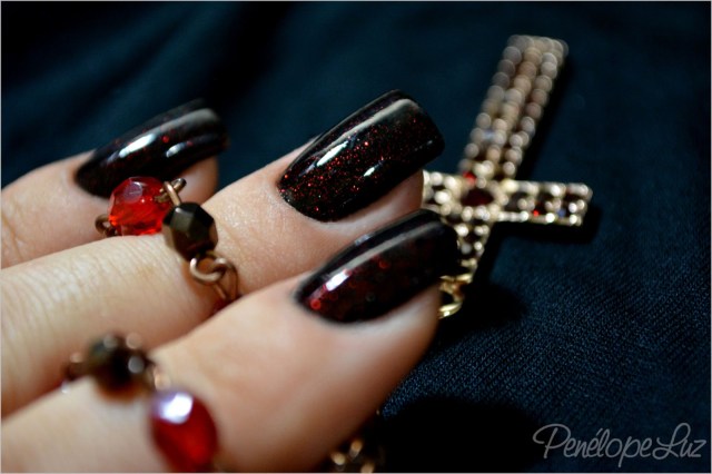 Eu não dava nada por ele, viu! Mas ele é lindo! Ele só é ralinho, mas se não fosse, não ficaria tão bonito, porque os glitters sumiriam todos no pigmento preto. Precisa ser ralinho para o glitter aparecer, então para não ter que dar muitas camadas, eu coloquei só uma camadinha de preto fosco por baixo. Aí finalizei com duas camadas do Viúva Negra e ficou perfeito!