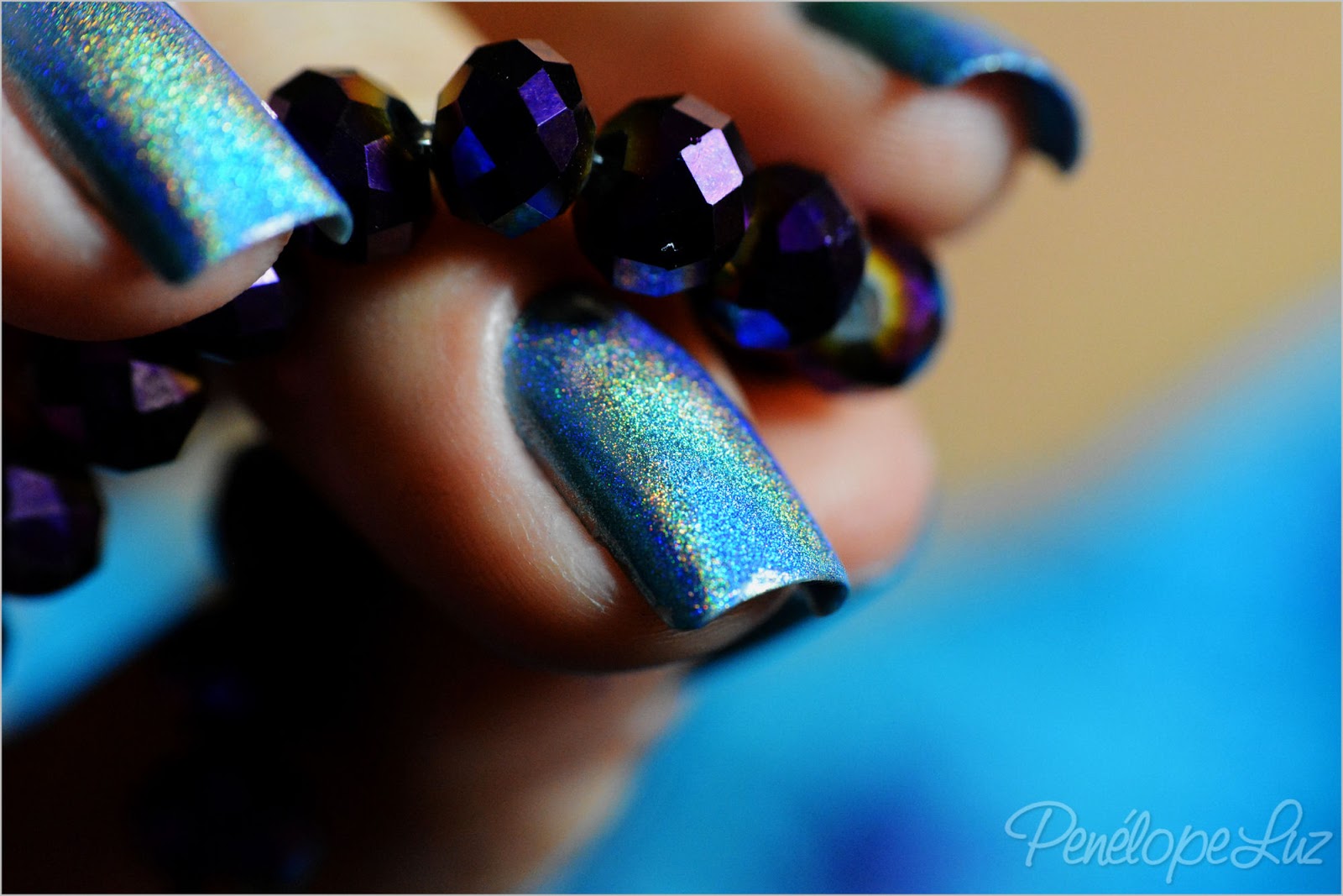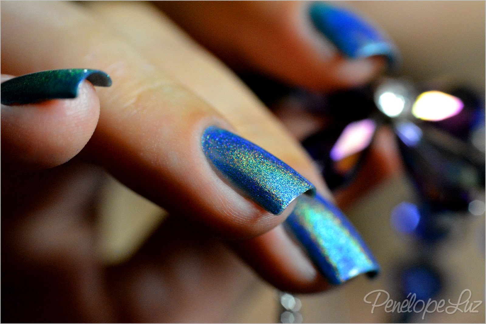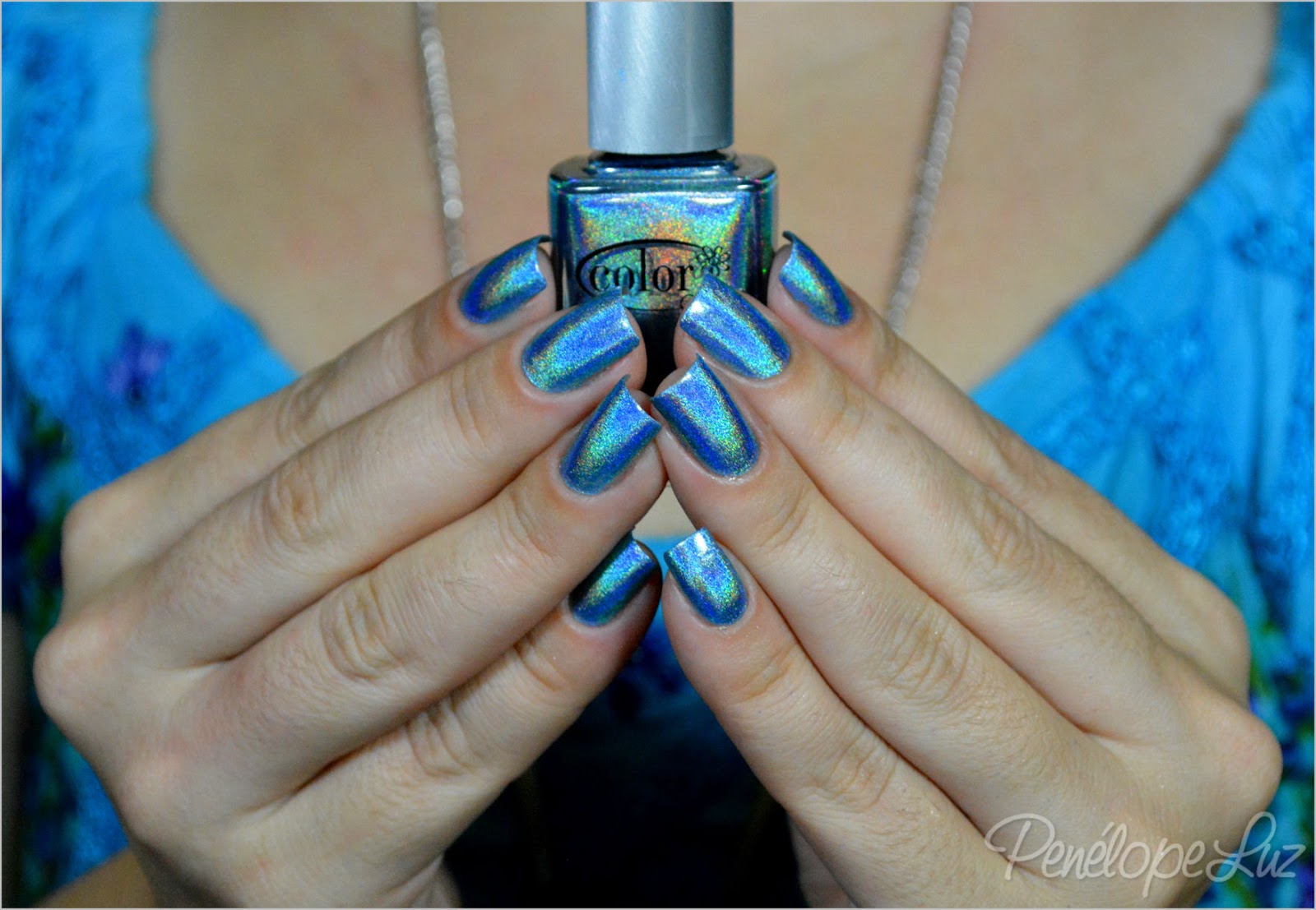A cor das fotos está bem fiel, ele é lindo assim mesmo, e não importa a iluminação, o prisma tá lá! Ele também é bem pigmentado, apenas 2 camadas é mais que suficiente para cobrir bem a unha, e fica perfeito para carimbar também. Outra coisa maravilhosa desses esmaltes da Color Club é que o Top Coat não interfere em absolutamente nada no prisma, e eles podem ser usados com qualquer base. Eu ainda não tinha usado com Top Coat, mas quando coloquei esse azul, eu estava com muita pressa e coloquei o top coat, já com medo de sair o prisma, mas para minha surpresa, quando passei o seche-vite, o esmalte nem deu aquele efeito molhado que os holos dão quando colocamos TC, sabem? Perdem o prisma por uns segundos e depois vai voltando, sabem? Com esse não, passa o TC e o prisma fica do jeito que tá, uma maravilha!