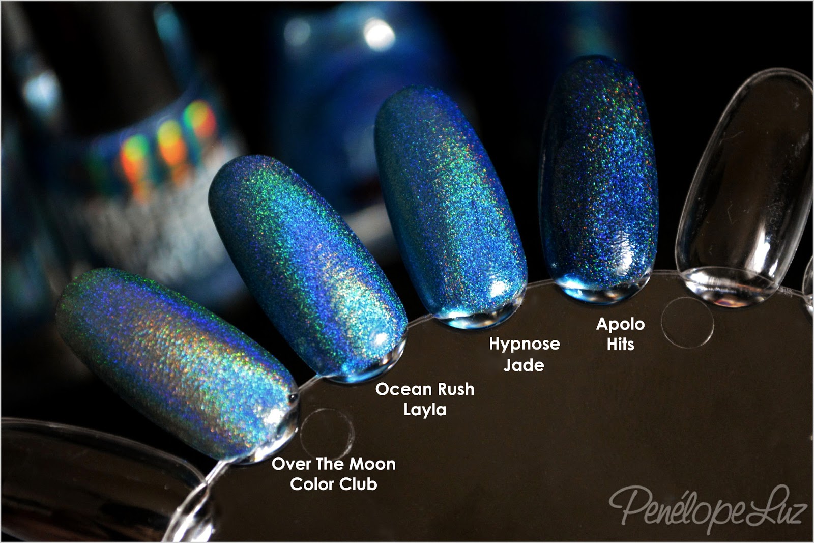 Ele é o mais holo, sem dúvidas, e o prisma dele é mais suave também. O Layla também tem muito prisma, mas o Color Club humilha ele, tadinho! O Hypnose fica mais discreto ainda em holografia, mas é um pouco mais escuro, e o Apolo além de ter beeeeeeem menos holografia, é mais escuro que os outros (um tom lindo, inclusive).