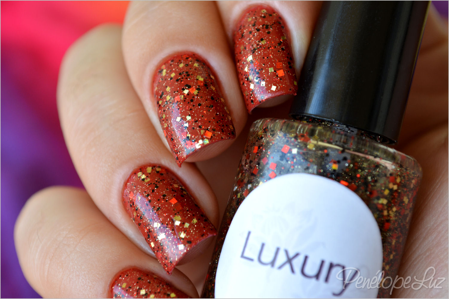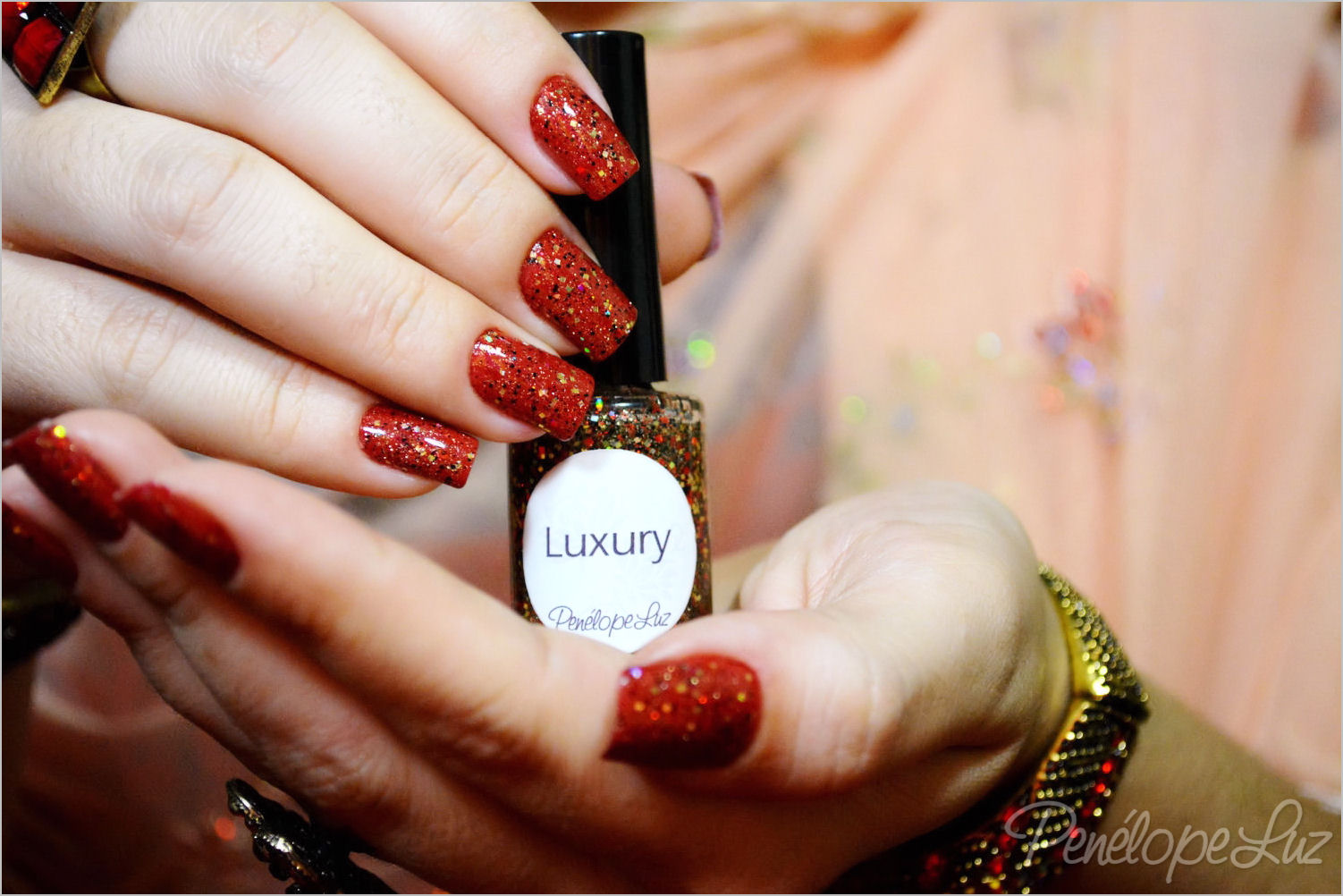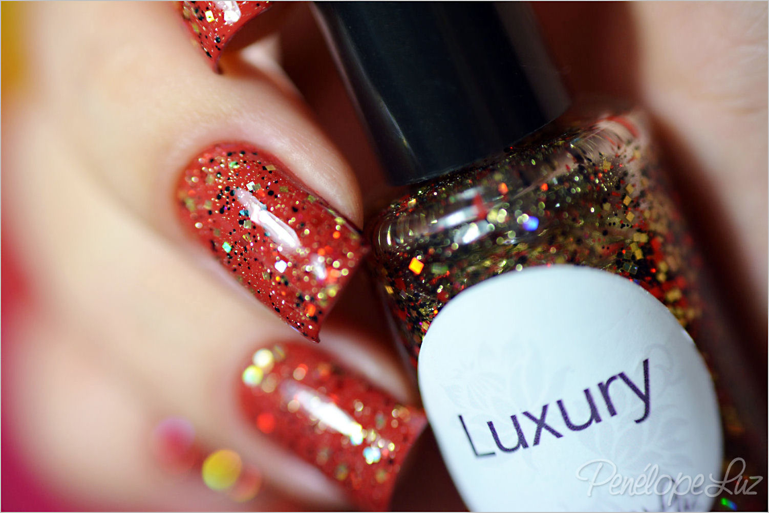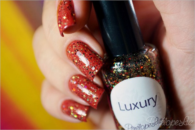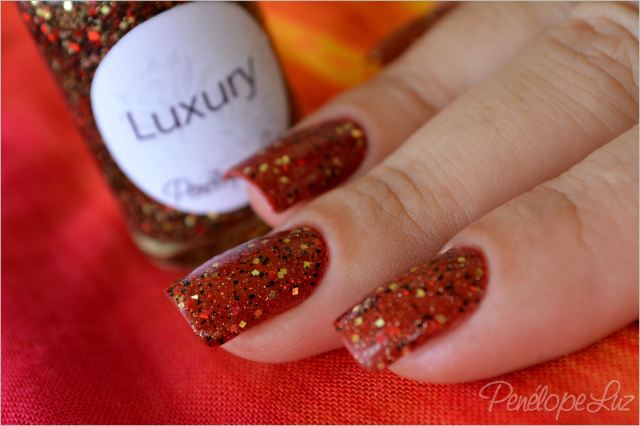 Ele é uma mistura de glitter vermelho e dourado holográficos, e mais glitter preto. A base dele é transpante, então pode ser usado sobre qualquer cor, e aí nas fotos está sobre o Alligator Purse da Essie, que é um vermelho puxando para o ferrugem: