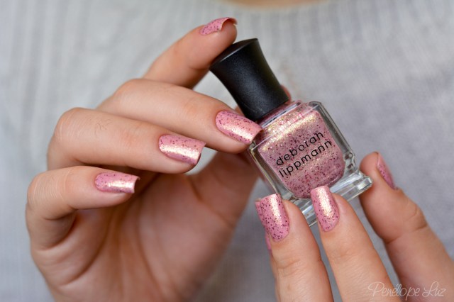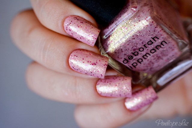Esse DL é muito lindo, ele tem pigmento sparkle dourado, uma base rosa-translúcida e glitters hexagonais pequenos em duas cores de rosa, um mais escuro e outro em tom pastel, ambos metálicos.