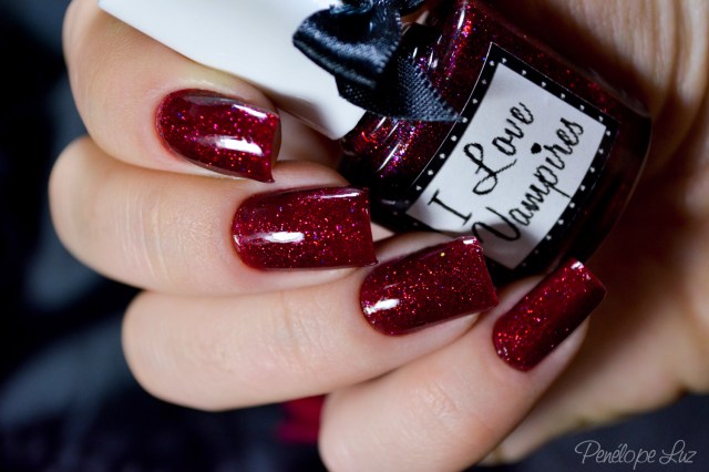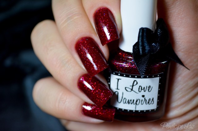 O esmalte de hoje é mais um lindo da Kelly, um que fiquei de olho desde o dia que ela mostrou pela primeira vez, porque igual a Kelly, adoro uma história de vampiros! E ele tem tudo a ver, é vermelho, glamouroso, feminino (as vampiras que, não importa o estilo, são sempre muito femininas, até Bella Swan ficou mulherão quando virou vampira, e quem diria que ela conseguiria? :P), é lindooo!!