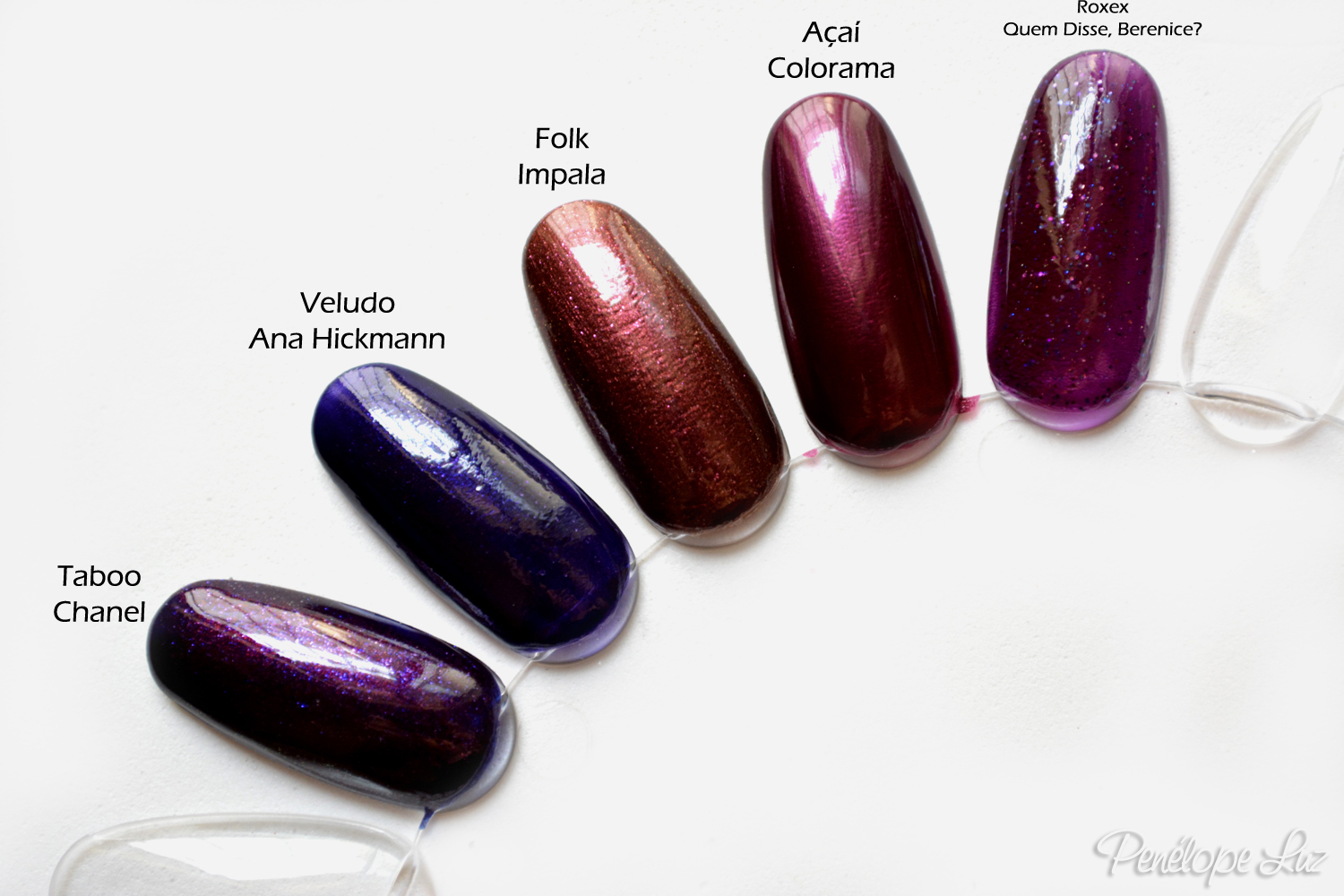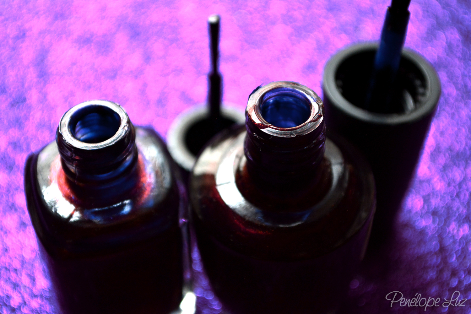 Eu sou apaixonada por esmaltes nesse tom, então eu tenho MUITOS, de várias marcas, de vários países, de vários tipos, e mesmo assim não tinha nenhum parecido com ele. O que mais se aproximou foi o Every Month is Oktoberfest da OPI, que tem a mesma base azulada que ele, mas o tom é diferente, o OPI é mais marrom e o Taboo mais roxo. A base azulada faz muita diferença no acabamento e eu só vi até hoje nesses dois esmaltes. Tirei uma foto do bocal do esmalte para vocês visualizarem o que estou falando. O Chanel à esquerda e o OPI à direita, ambos com essa base azul, que não deixa o esmalte azul, mas dá um tom único à eles quando misturado com as partículas do outro pigmento (nisso que eles se diferenciam, o Chanel tem glass flaked azul e roxo e o OPI tem shimmer duochrome vermelho e dourado).
