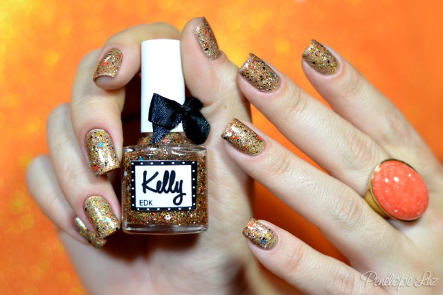 Ele tem glitters bem fininhos dourado, laranja e preto, glitters ainda pequenos, mas um pouco maiores nas cores branco, laranja, amarelo e preto, e glitters maiores preto, vermelho, laranja, amarelo e teal. Ficou perfeitíssima a mistura de cores e a mistura entre o metálico e o pastel nos glitters! Tô apaixonada por esse EDK!
