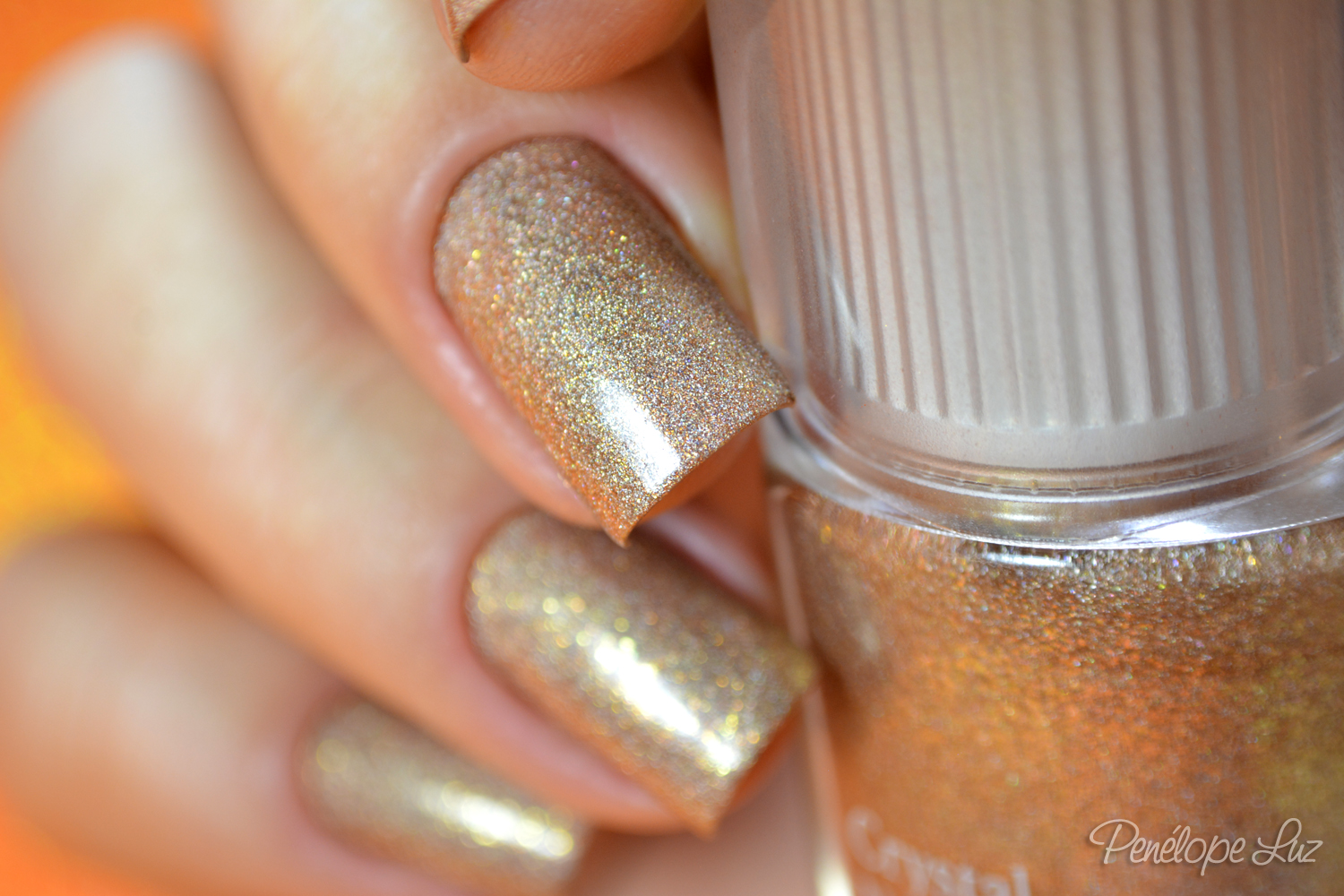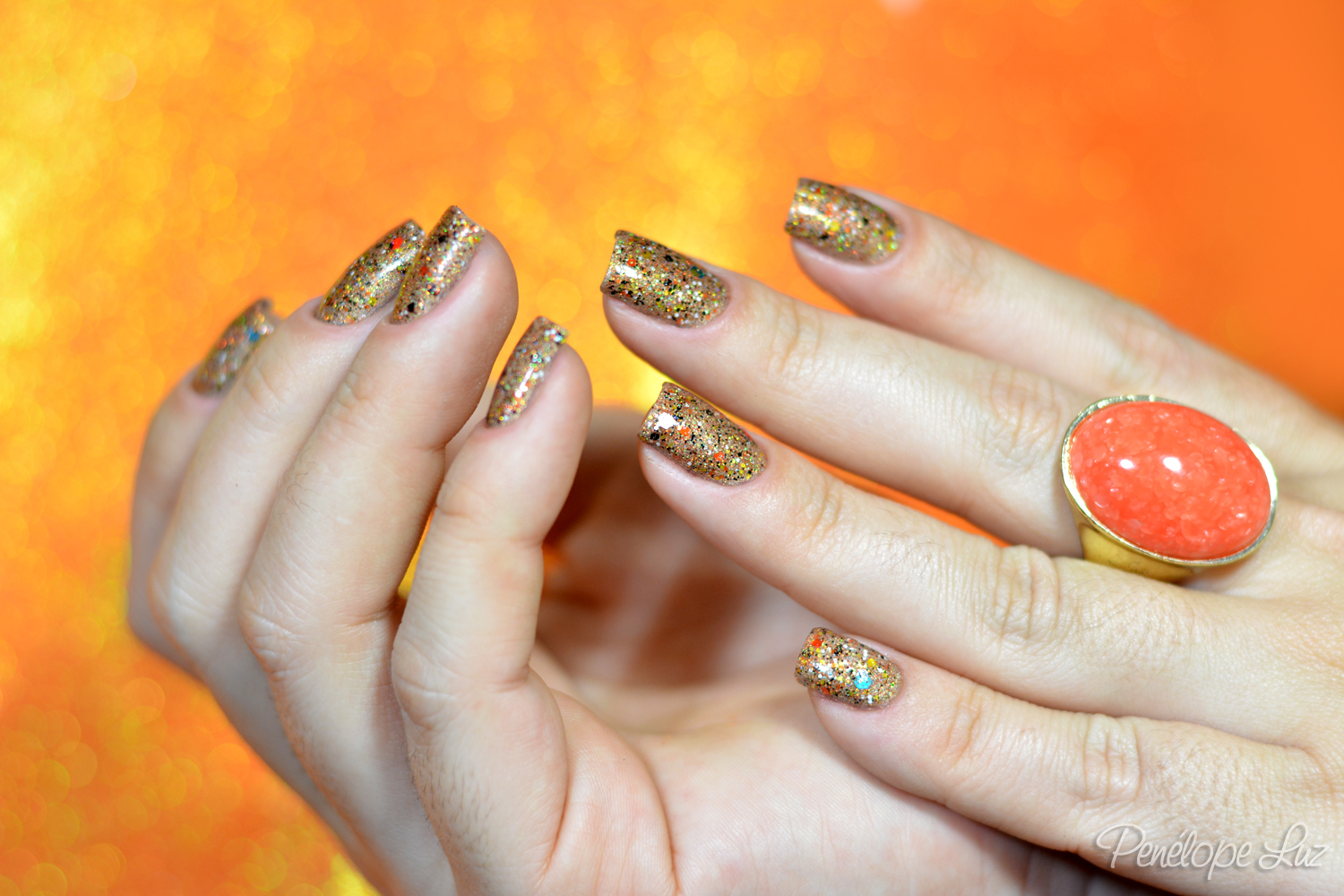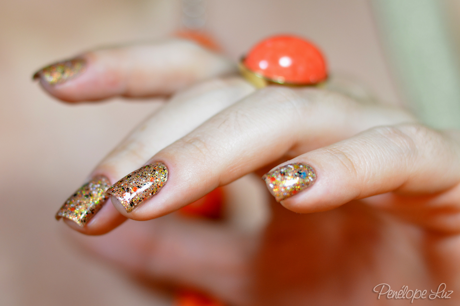 Ele tem glitters bem fininhos dourado, laranja e preto, glitters ainda pequenos, mas um pouco maiores nas cores branco, laranja, amarelo e preto, e glitters maiores preto, vermelho, laranja, amarelo e teal. Ficou perfeitíssima a mistura de cores e a mistura entre o metálico e o pastel nos glitters! Tô apaixonada por esse EDK!