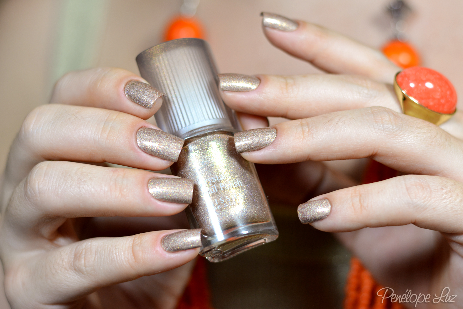 Ele tem uns microbrilhos dourados que dão uma profundicada incrível e única, nunca tinha visto um igual, é muito delicado e diferente, e com duas camadas já fica perfeito!