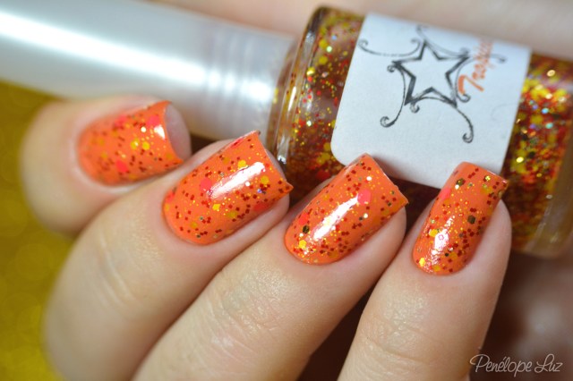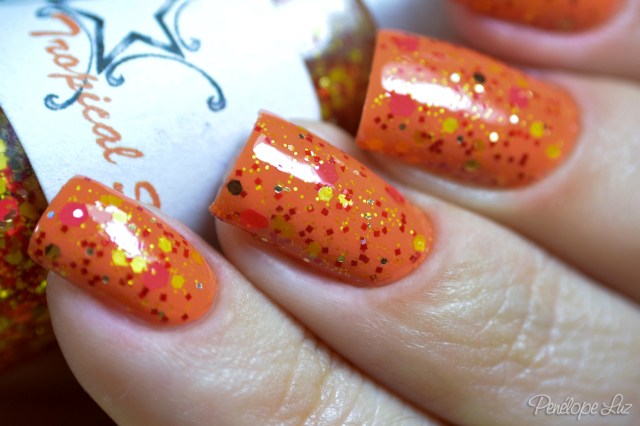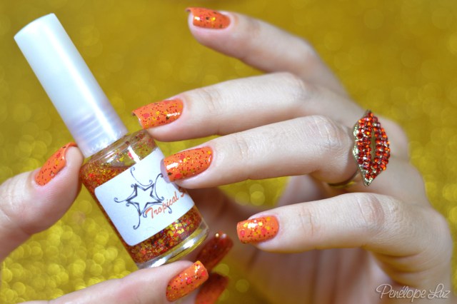 Hoje quero mostrar uma marca indie que gostei bastante de conhecer, a Indies May, da Maíra Almeida, que é uma fofa! Há um tempo atrás ela me mandou 4 cores que ela faz e adorei todas! De cara eu tinha gostado mais do Snowstorm, mas depois de fazer combinações nos disquinhos e tudo o mais, acabei de apaixonando pelo Tropical Sunset! Como é lindo, muito alegre! Penei pra achar um tom de laranja que ficasse perfeito com ele, e não queria usar com nude, queria algo mais alegre, como ele pede, e como tem pouco tempo que me rendi aos laranjas, eu tinha poucos dessa cor na minha coleção. Finalmente encontrei um da Quem disse Berenice?, o Laranjola, que era ideal! Deixava destacado todos os glitters e dava um aspécto vivo às unhas!