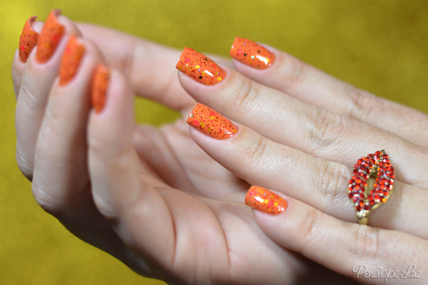 Hoje quero mostrar uma marca indie que gostei bastante de conhecer, a Indies May, da Maíra Almeida, que é uma fofa! Há um tempo atrás ela me mandou 4 cores que ela faz e adorei todas! De cara eu tinha gostado mais do Snowstorm, mas depois de fazer combinações nos disquinhos e tudo o mais, acabei de apaixonando pelo Tropical Sunset! Como é lindo, muito alegre! Penei pra achar um tom de laranja que ficasse perfeito com ele, e não queria usar com nude, queria algo mais alegre, como ele pede, e como tem pouco tempo que me rendi aos laranjas, eu tinha poucos dessa cor na minha coleção. Finalmente encontrei um da Quem disse Berenice?, o Laranjola, que era ideal! Deixava destacado todos os glitters e dava um aspécto vivo às unhas!
