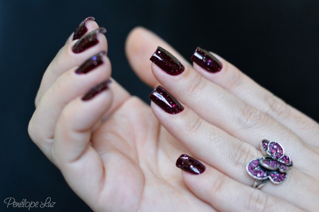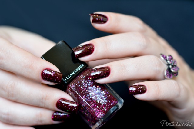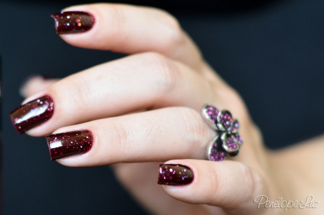 Quero mostrar hoje um esmalte que quando vi, fiquei doida! Mas não achei ele fácil, então demorei bastante até conseguir o meu. Finalmente achei no ebay por um preço razoável. Ele vem num kit junto com outro, o Viridian, que também é lindo, então valeu muito à pena. O Glitterati tem  glitters de muitos tamanhos prata holográfico e um pigmento jelly vinho, que cobre bem com duas camadas.