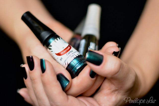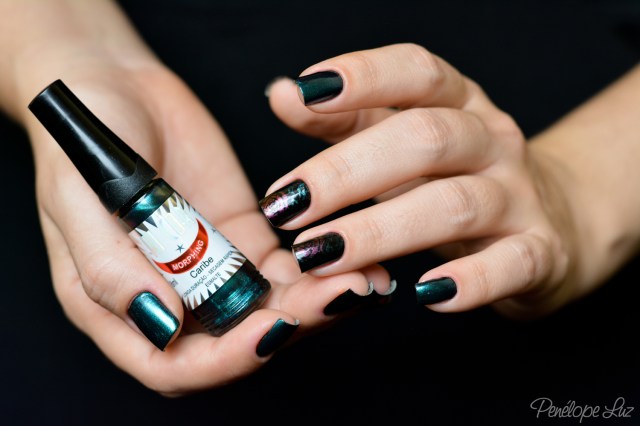 Adoro carimbar com esmalte duochrome, fica tão lindo! Discreto e lindo! O Caribe fica verde e roxo e o efeito aparece mais na luz artificial quando tem dois pontos de luz. Na luz natural não aparece tanto, não é como os da coleção Aurora Boreal da Ludurana ou como da Coleção Mari Moon da Hits, mas mesmo sendo mais discreto é lindíssimo! Na sombra dá pra ver melhor o efeito do carimbo, porque como os duochromes são menos pigmentados, o efeito fica mais discreto e na sombra é que dá para ver bem.