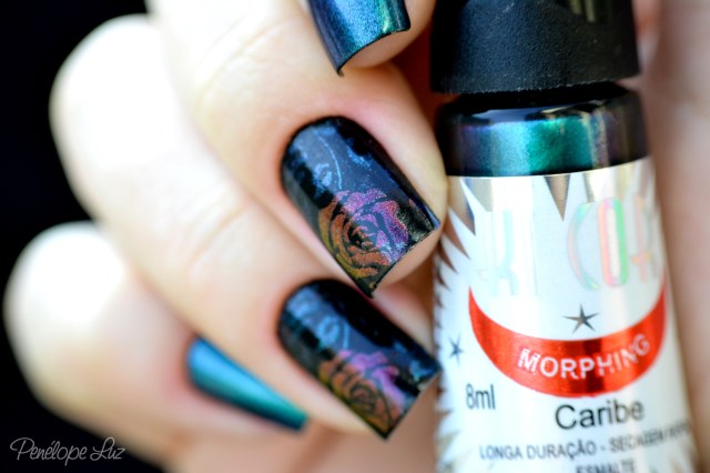 Há muito tempo que eu não usava plaquinhas de carimbo, mas agora que comprei várias novas, tive que tomar vergonha na cara e carimbar. Escolhi uma da PUEEN, a pueen22 e gostei demais! Além da embalagem linda, ainda tem qualidade! Para carimbar escolhi dois esmaltes duochromes, um da coleção Aurora Boreal da Ludurana, o Fascinante, e o outro um da Ki-cor, o Caribe. Como esmalte base escolhi o Preto também da Ki-cor. Fiz aquela técnica que já ensinei nesse post aqui, de colorir com mais de uma cor a carimbada.