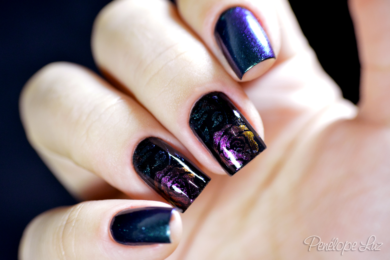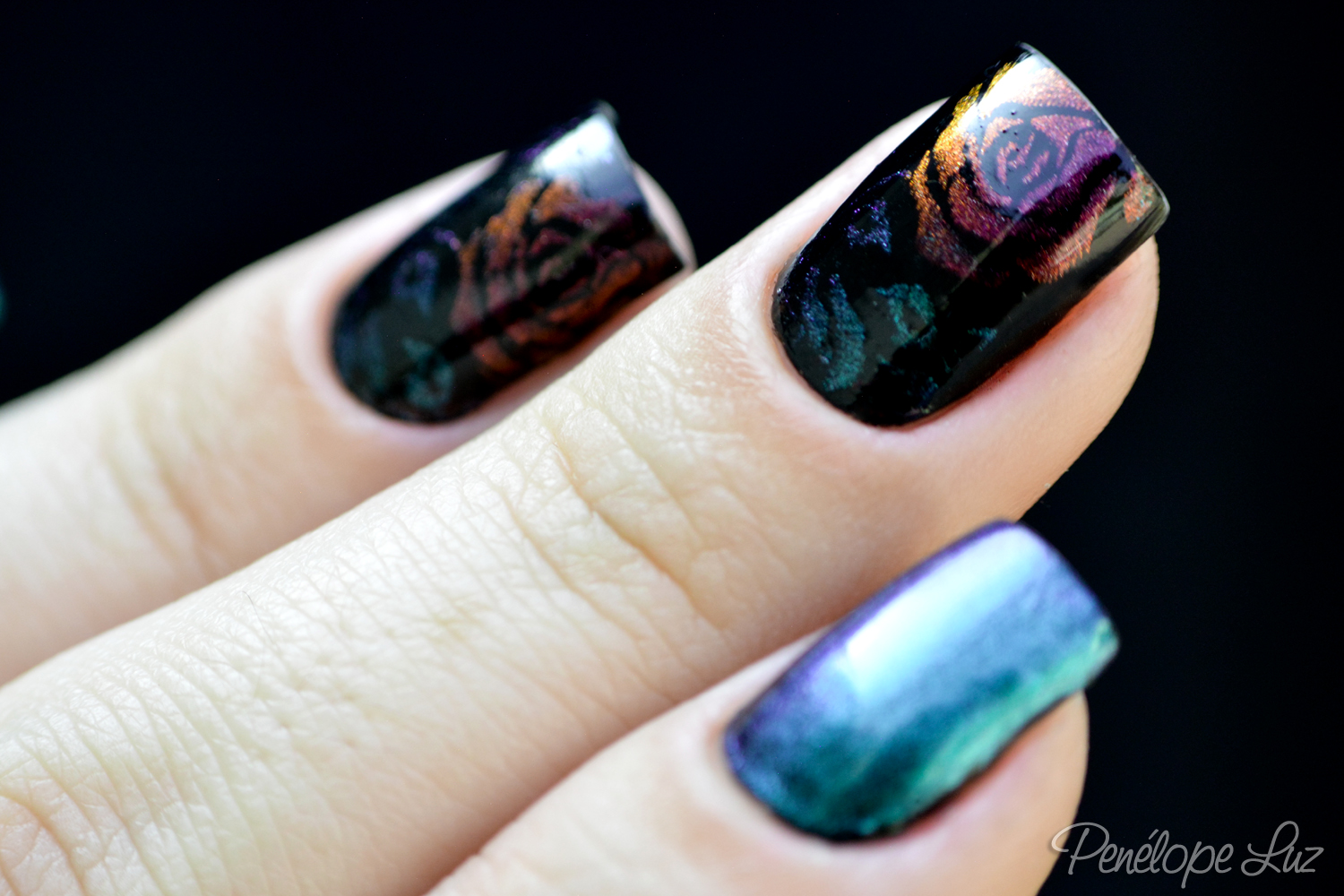 Há muito tempo que eu não usava plaquinhas de carimbo, mas agora que comprei várias novas, tive que tomar vergonha na cara e carimbar. Escolhi uma da PUEEN, a pueen22 e gostei demais! Além da embalagem linda, ainda tem qualidade! Para carimbar escolhi dois esmaltes duochromes, um da coleção Aurora Boreal da Ludurana, o Fascinante, e o outro um da Ki-cor, o Caribe. Como esmalte base escolhi o Preto também da Ki-cor. Fiz aquela técnica que já ensinei nesse post aqui, de colorir com mais de uma cor a carimbada.
