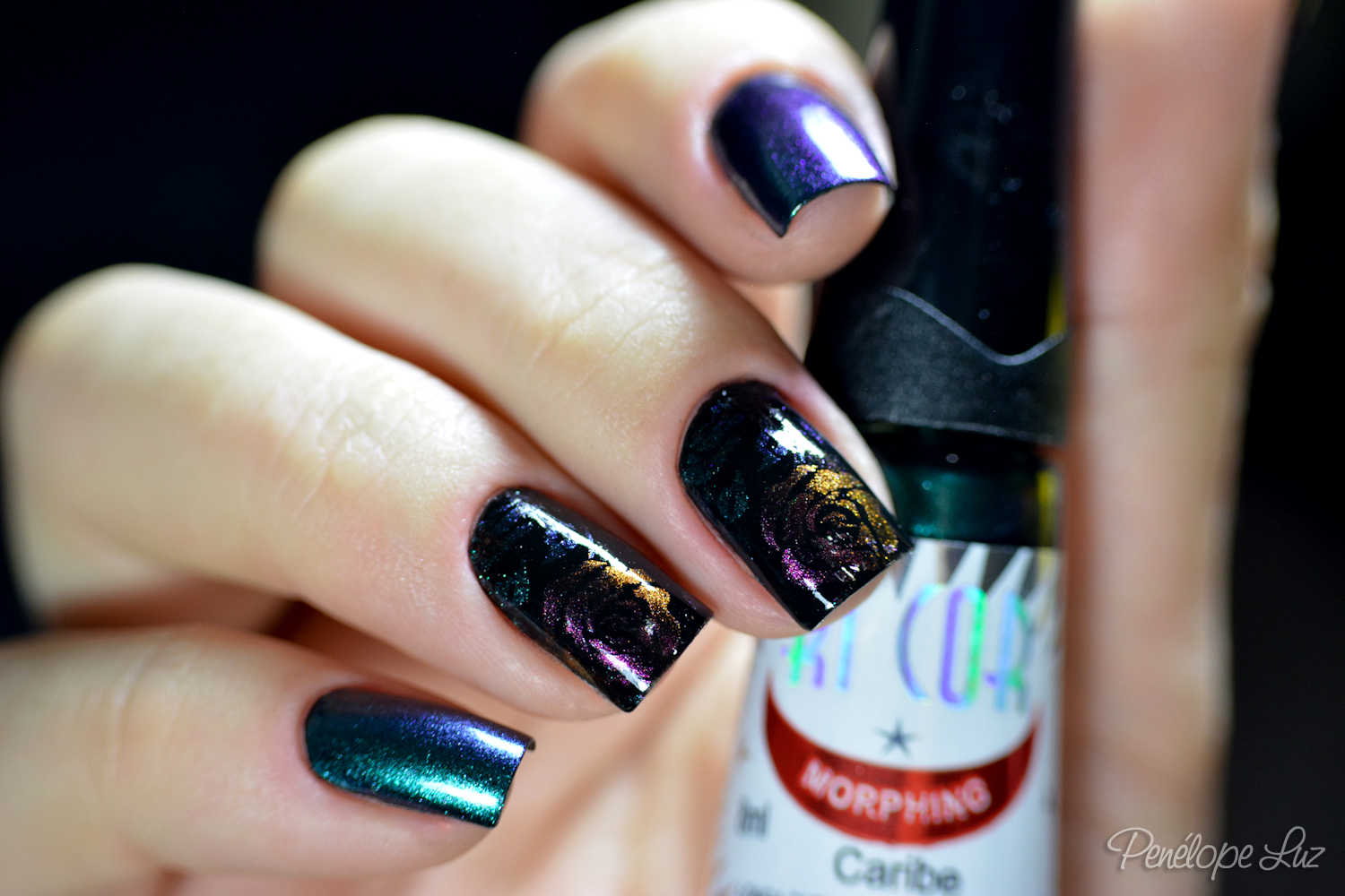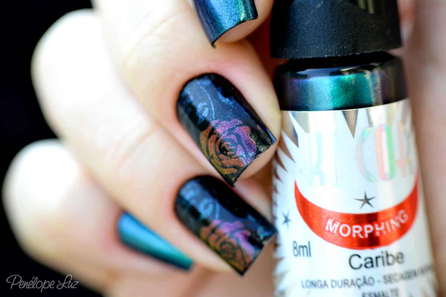 Adoro carimbar com esmalte duochrome, fica tão lindo! Discreto e lindo! O Caribe fica verde e roxo e o efeito aparece mais na luz artificial quando tem dois pontos de luz. Na luz natural não aparece tanto, não é como os da coleção Aurora Boreal da Ludurana ou como da Coleção Mari Moon da Hits, mas mesmo sendo mais discreto é lindíssimo! Na sombra dá pra ver melhor o efeito do carimbo, porque como os duochromes são menos pigmentados, o efeito fica mais discreto e na sombra é que dá para ver bem.