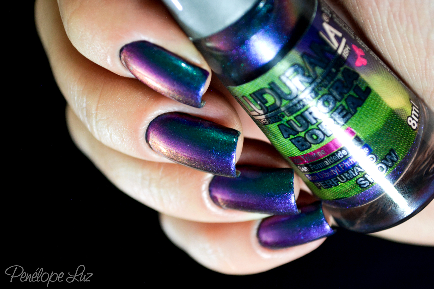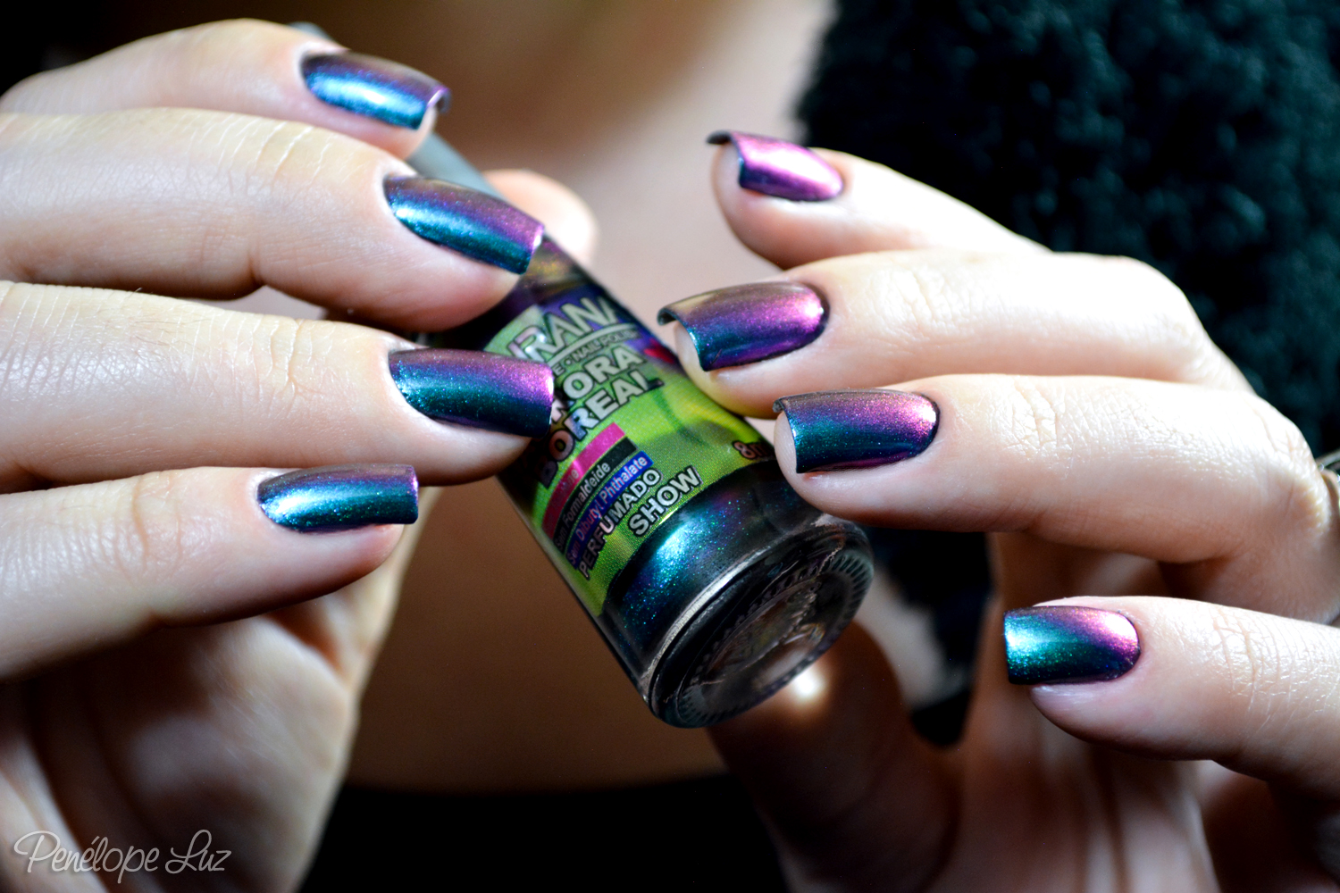 Desenterrei meu Show que estava sem uso há quase um ano! Tenho estoque dele, já acabei com dois vidrinhos, usei muito, muito mesmo, mas já tem um tempo que eu estava profundamente enjoada do cheiro da coleção Aurora Boreal (empresas de esmaltes, não coloquem cheiro nos esmaltes, a gente continua gostando da cor, mas enjoa do cheiro e larga eles de lado!). Mas estava com tanta vontade de multichrome que encarei o cheiro! (eu sei, vocês podem dizer que eu poderia usar o Cutie Pie da Hits ou o 505 da Ozotic, mas de todos eles, eu gosto mais do Show, tenho a impressão – e aqui é coisa de viciada doida – que o efeito do show é mais forte e as partículas brilham mais, daí gosto mais dele mesmo com o cheiro enjoado). 😛