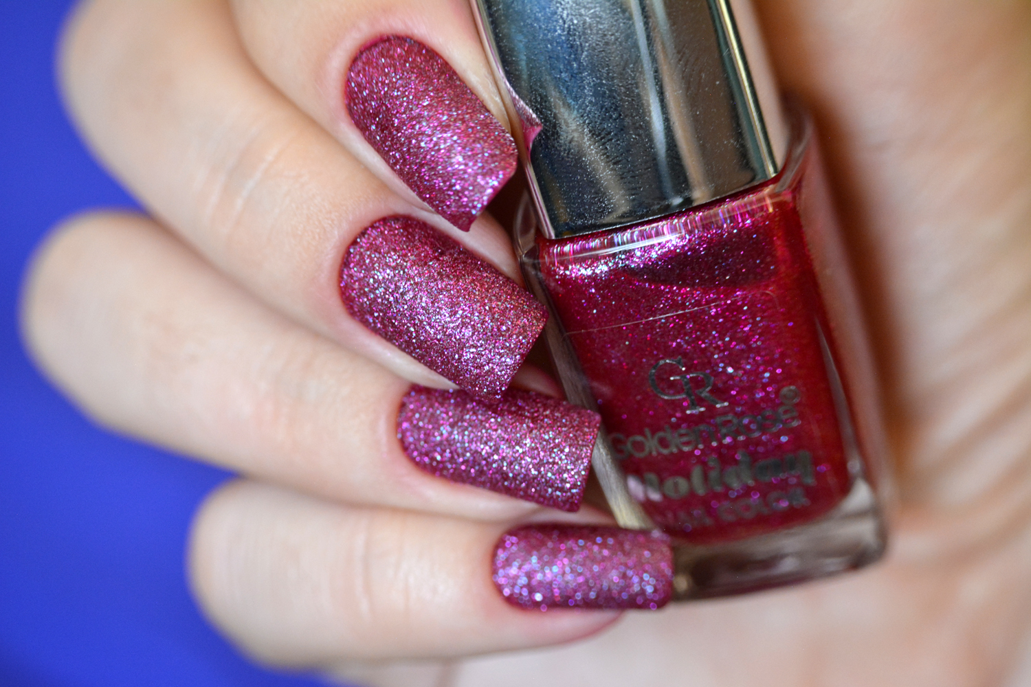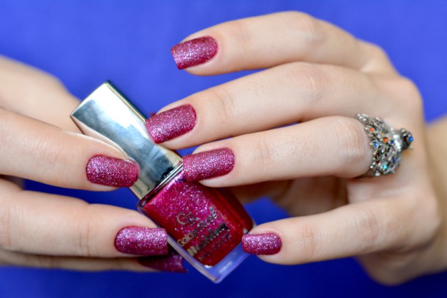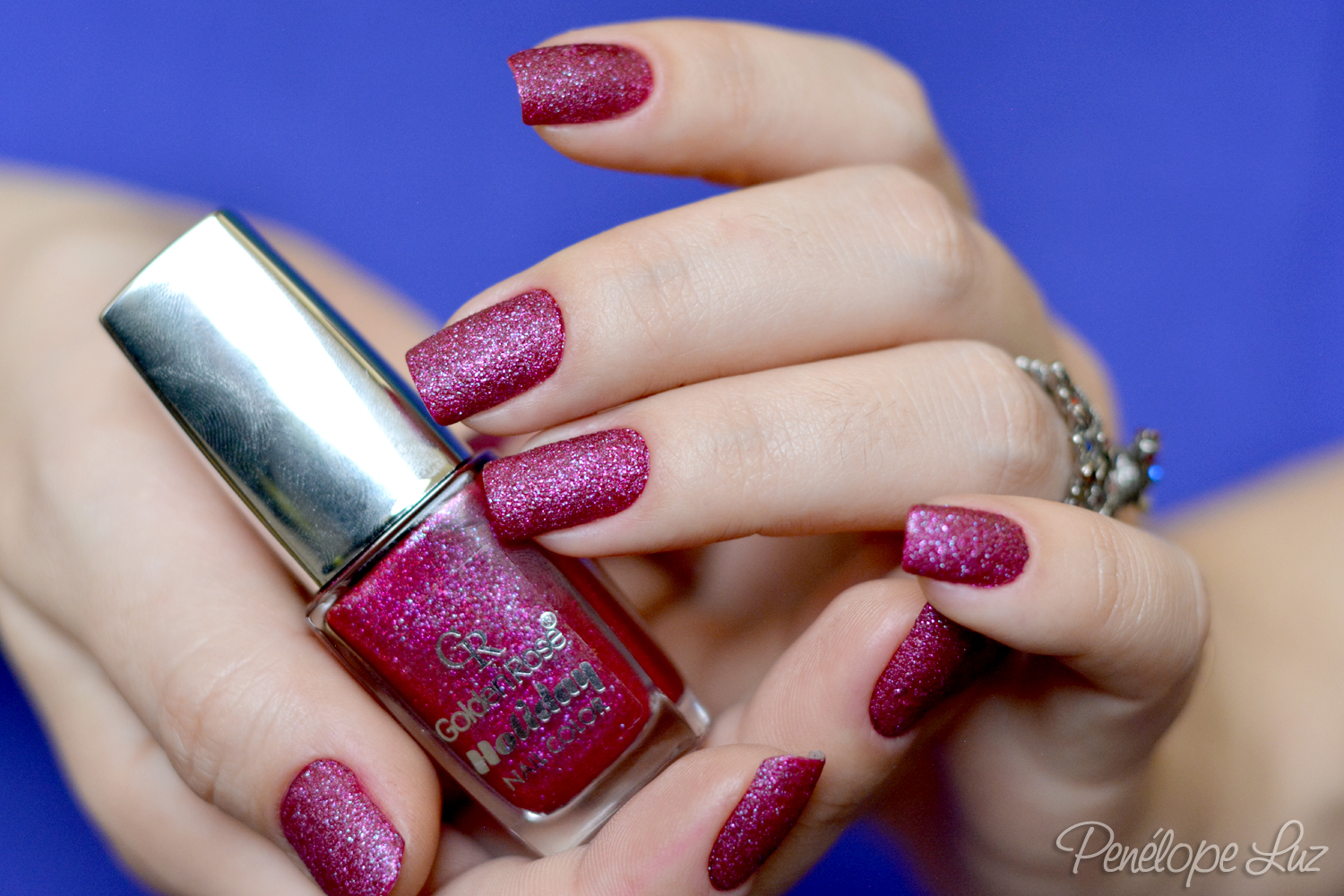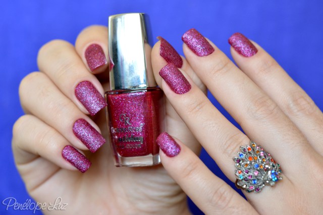 O esmalte de hoje é mais um liquid sand (nunca pensei que fosse gostar tanto desse acabamento!) e um dos mais lindos que já usei, o 57 da coleção Holiday da Golden Rose! Comprei despretensiosamente, sem saber se seriam bons e gostei bastante. Ele só não é mto pigmentado, então coloquei uma camada de um esmalte vinho por baixo (no caso o Vinhito da Quem disse, Berenice?) para não precisar de 3 camadas, o que para mim é muito em se tratando de liquid sand. Não gosto da unha muito “cheia”, então coloco um cremoso bem pigmentado e uso apenas duas camadas do liquid sand. Ficou na mesma cor do vidrinho e o acabamento mais delicado. 🙂