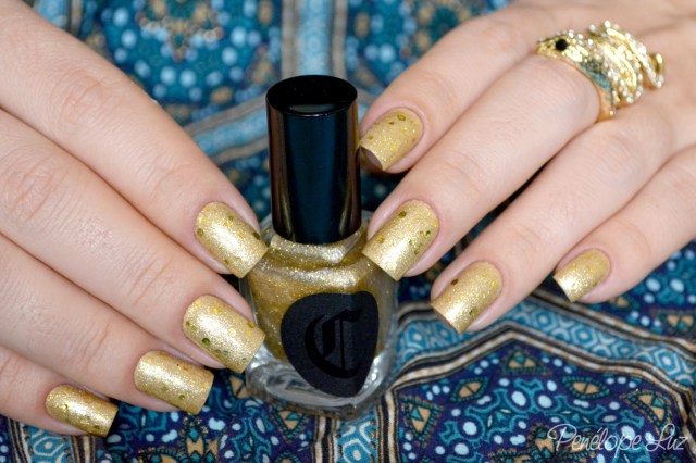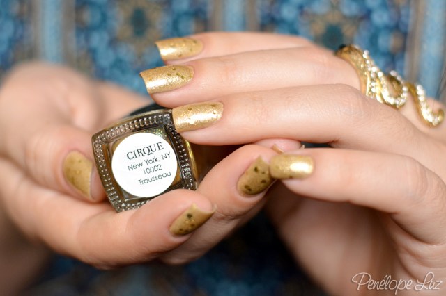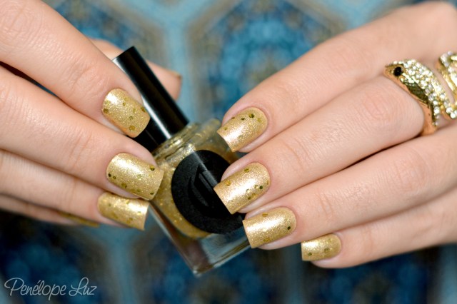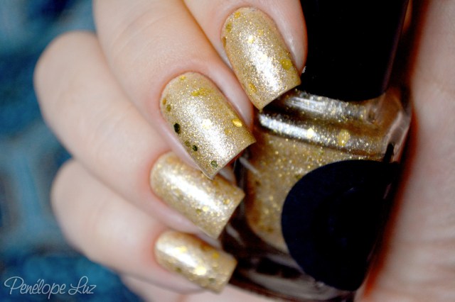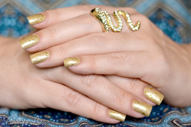 O Kalahari Kiss é bem pigmentado, gostei bastante de esmaltar com ele, apenas duas camadas deixou o acabamento perfeito. O Trousseau tem um pigmento dourado que lembra o glitters e brilha bastante e mais glitters grandes em dois tamanhos que dão um charme bem lindo ao visual! Duas camadas dele e fica perfeito também.