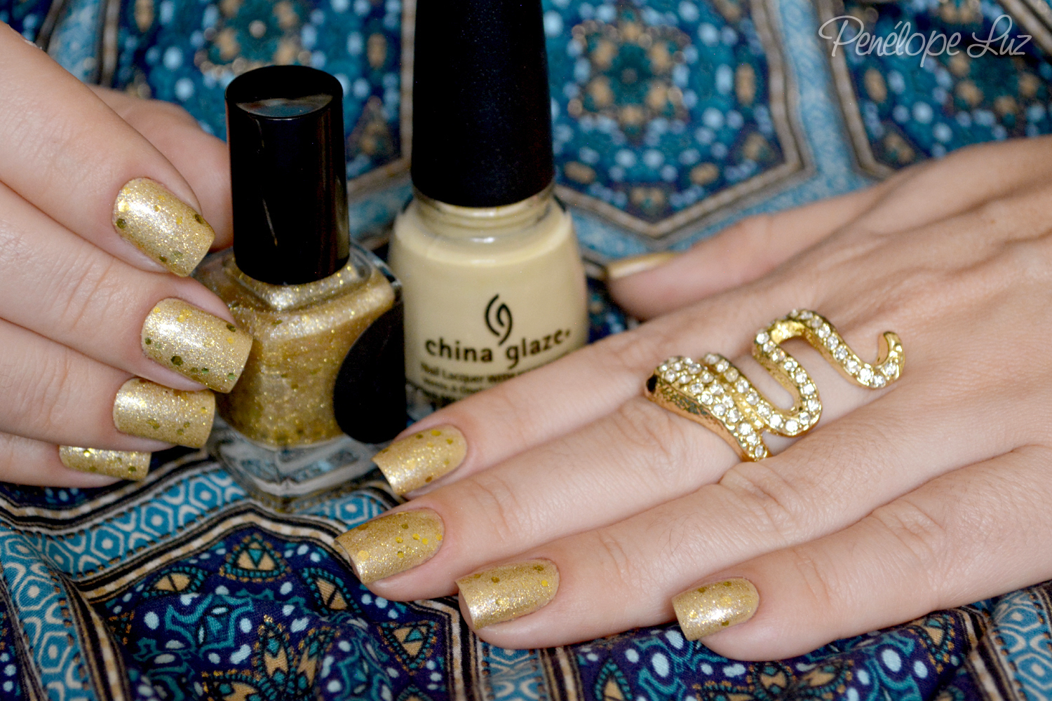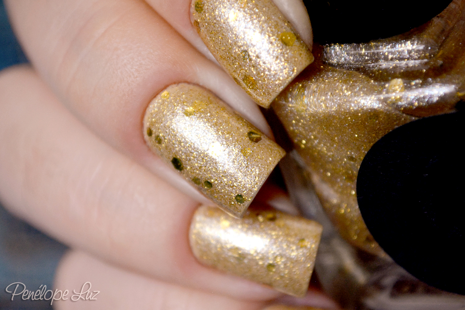 O Kalahari Kiss é bem pigmentado, gostei bastante de esmaltar com ele, apenas duas camadas deixou o acabamento perfeito. O Trousseau tem um pigmento dourado que lembra o glitters e brilha bastante e mais glitters grandes em dois tamanhos que dão um charme bem lindo ao visual! Duas camadas dele e fica perfeito também.