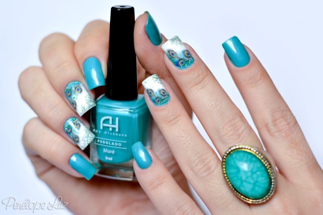 Um dia desses a Eva postou essa mani aqui que fiquei loucamente apaixonada, quis logo arrumar os adesivos para fazer igual, mas antes que eu tivesse tempo de providenciar, chegou aqui em casa uma comprinha que eu tinha feito há muito tempo na loja Born Pretty Store, e junto estava um adesivo de pavão que eu nem lembrava mais que tinha comprado, e que substituiria muito bem o que a Eva usou! 😀 😀 😀