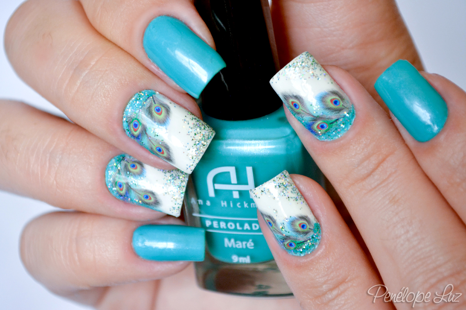 Um dia desses a Eva postou essa mani aqui que fiquei loucamente apaixonada, quis logo arrumar os adesivos para fazer igual, mas antes que eu tivesse tempo de providenciar, chegou aqui em casa uma comprinha que eu tinha feito há muito tempo na loja Born Pretty Store, e junto estava um adesivo de pavão que eu nem lembrava mais que tinha comprado, e que substituiria muito bem o que a Eva usou! 😀 😀 😀