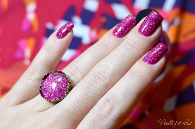 Brilha DEMAIS, passei uns bons dias com ele e essa foi a terceira vez que usei (das outras vezes não deu para fotografar, das outras vezes o extra-brilho encolheu ele, ficou feio pra tirar foto). Precisei de uma camada de base pra glitter da 5cinco e uma de Poshé pra deixar ele lisinho.