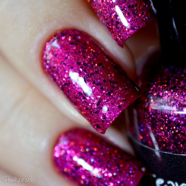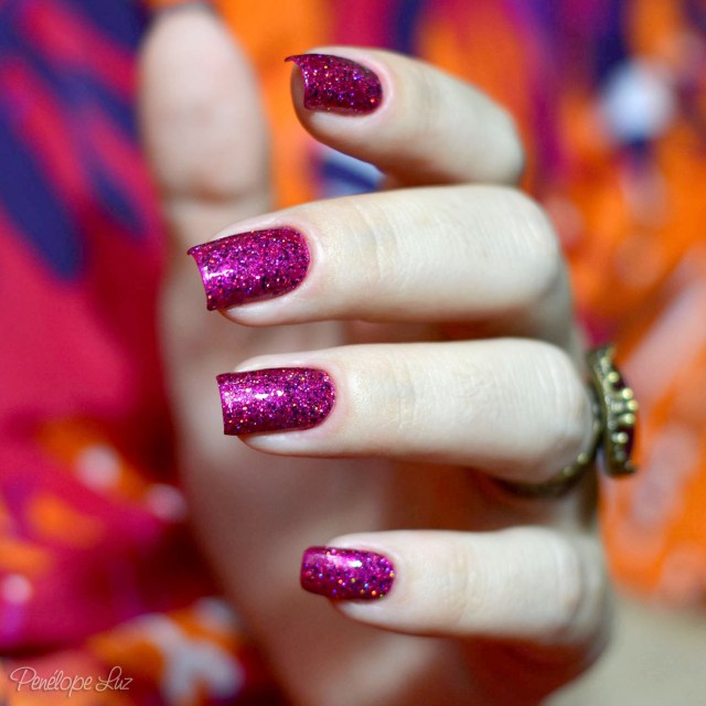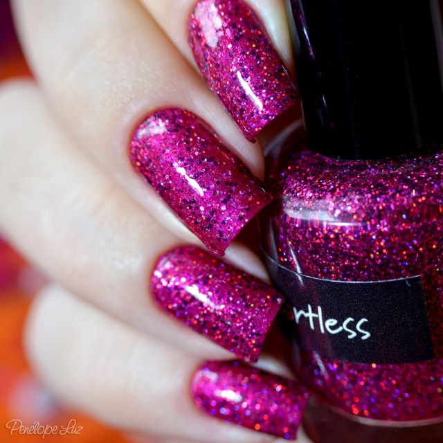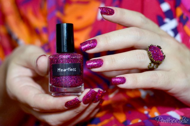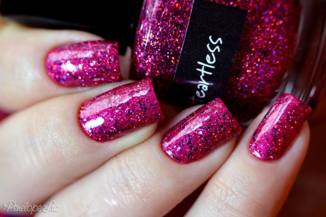 Depois de curtir um pouquinho o Anaka, coloquei uma camada do Heartless, que é bem concentrado, e uma apenas basta se tiver um esmalte base. Ele é lindo, tem glitters rosa holo de dois tamanhos e mais glitter vinho (achava que era preto, mas nas fotos em macro vi que era vinho):