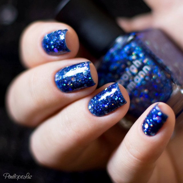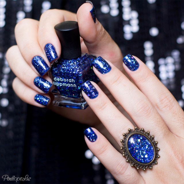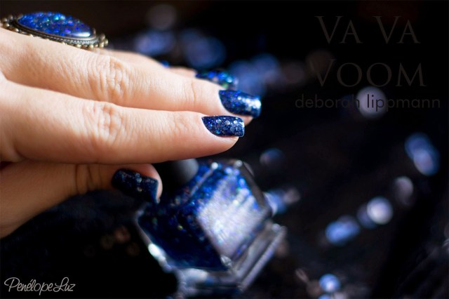 O Va Va Voom da Deborah Lippmann é composto por uma base jelly azul marinho e glitters holográficos hexagonais de 3 tamanhos nas cores prata e azul royal. Usei como base o Brilliant Blue da L.A. Girls. Para quem não sabe, base jelly é aquela base que apesar de ter cor, não é opaca, é como uma gelatina mesmo, conseguimos ver através da cor. Esmaltes com glitter ou pigmento holográfico precisam de base jelly, porque a luz precisa atravessar a cor para que o prisma se forme. Se a base for opaca a luz não atravessa e consequentemente o prisma não acontece.