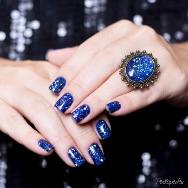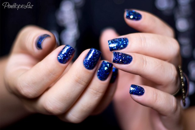 Coloquei duas camadas do Brilliant Blue e apenas uma do Va Va Voom, que é bem carregado de glitter. Depois passei uma camada de base de glitter da 5cinco e mais uma de Poshé.