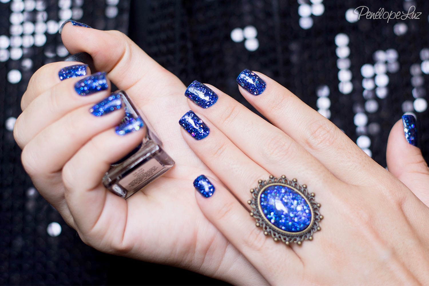 Coloquei duas camadas do Brilliant Blue e apenas uma do Va Va Voom, que é bem carregado de glitter. Depois passei uma camada de base de glitter da 5cinco e mais uma de Poshé.