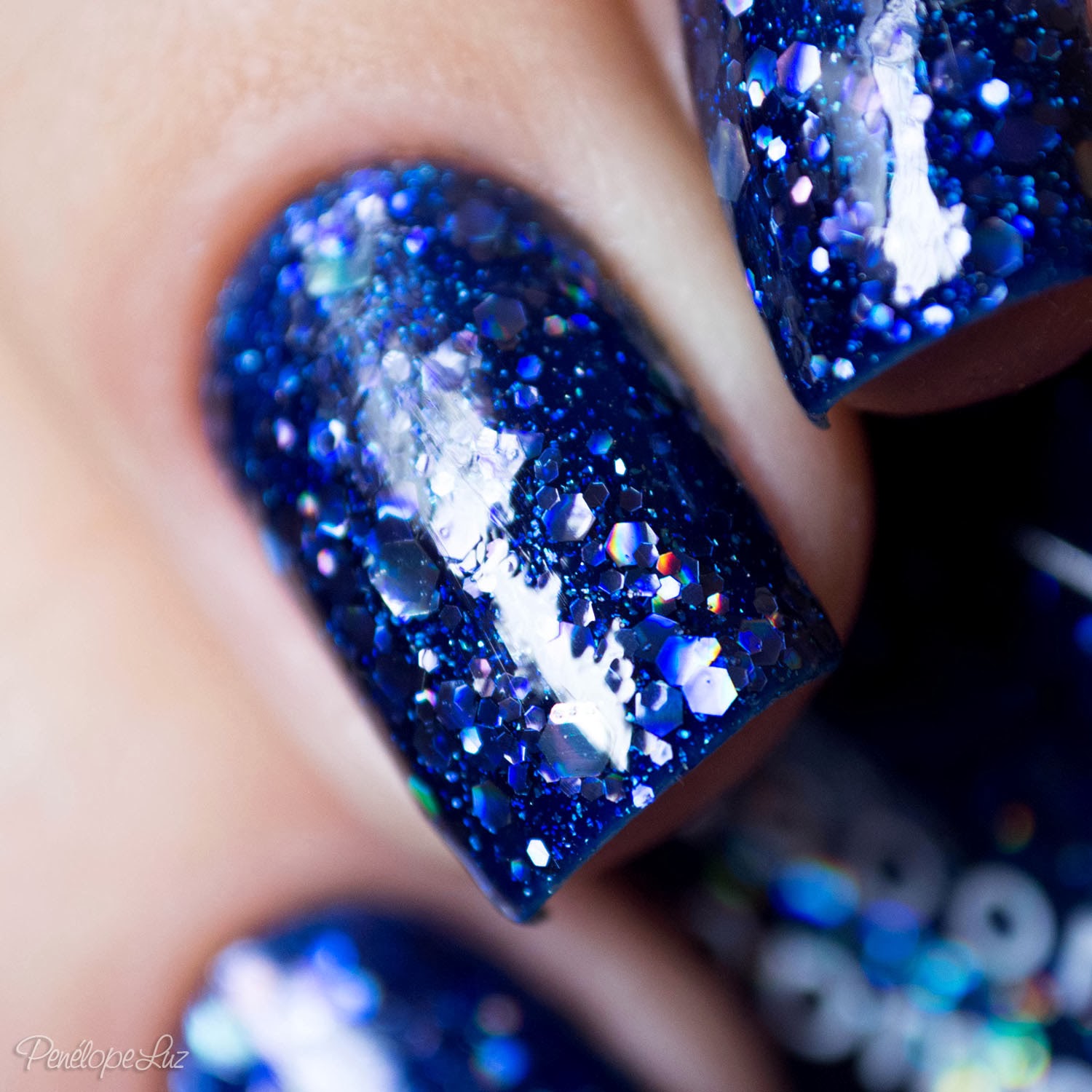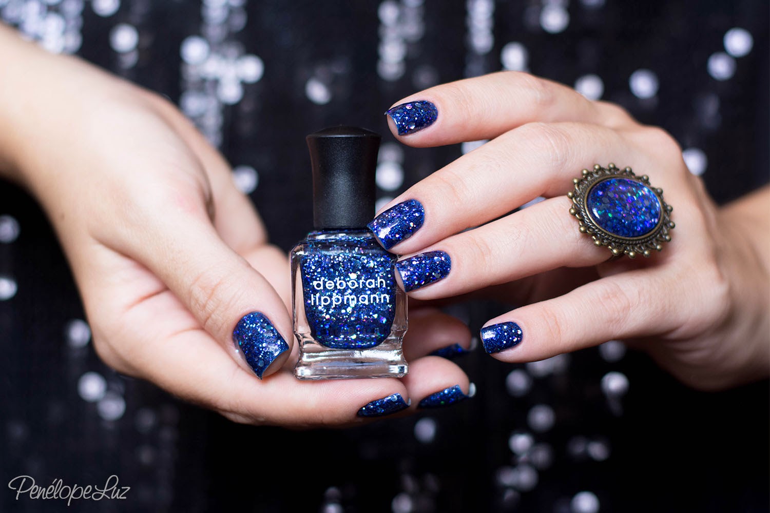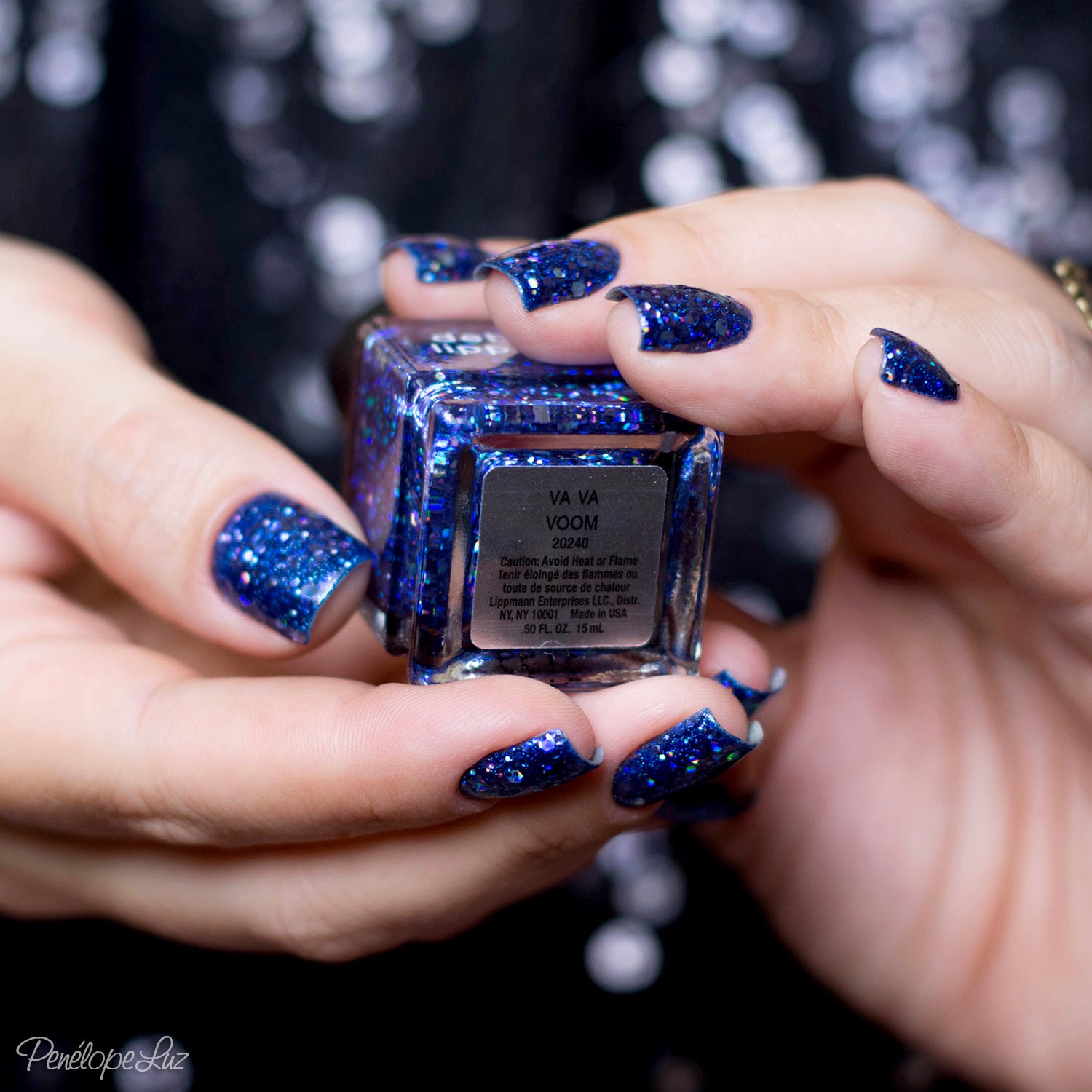 O Va Va Voom da Deborah Lippmann é composto por uma base jelly azul marinho e glitters holográficos hexagonais de 3 tamanhos nas cores prata e azul royal. Usei como base o Brilliant Blue da L.A. Girls. Para quem não sabe, base jelly é aquela base que apesar de ter cor, não é opaca, é como uma gelatina mesmo, conseguimos ver através da cor. Esmaltes com glitter ou pigmento holográfico precisam de base jelly, porque a luz precisa atravessar a cor para que o prisma se forme. Se a base for opaca a luz não atravessa e consequentemente o prisma não acontece.