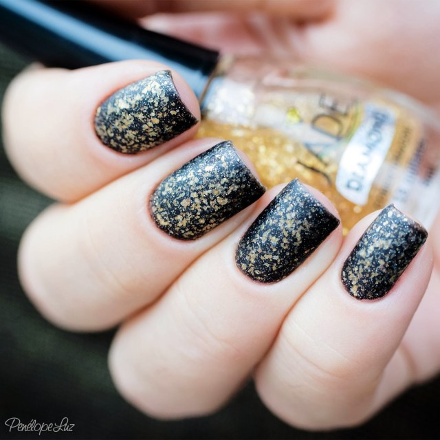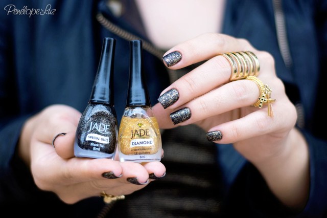 Semana passada chegou uma caixa da Jade aqui com a coleção nova e já quis logo usar esse flocado dourado, o 18 quilates! Eu já tive um igual a ele da Essie (Zoya também tem dele), mas não tinha dado bola, até dei o meu. Só agora com o Jade em mãos que pensei em experimentar com cobertura fosca e então que pude ver como ele é lindo! Escolhi outro Jade pra fazer par com ele, o Black Tie, e ficou perfeito! Vou usar muitas vezes essa combinação!