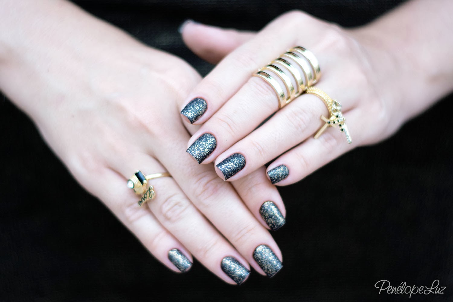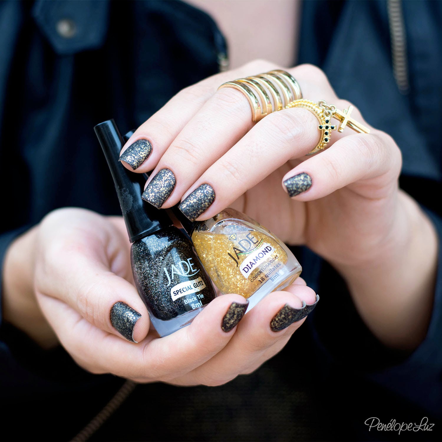 Semana passada chegou uma caixa da Jade aqui com a coleção nova e já quis logo usar esse flocado dourado, o 18 quilates! Eu já tive um igual a ele da Essie (Zoya também tem dele), mas não tinha dado bola, até dei o meu. Só agora com o Jade em mãos que pensei em experimentar com cobertura fosca e então que pude ver como ele é lindo! Escolhi outro Jade pra fazer par com ele, o Black Tie, e ficou perfeito! Vou usar muitas vezes essa combinação!