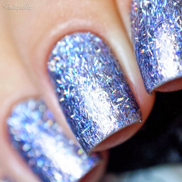Lindo, lindo, lindo! Ele é composto por micro glitters no formato de slices e tem uma base jelly levemente azulada. Queria bastante preenchido, então coloquei 3 camadas sobre uma de um prata para carimbo, só queria que tudo estivesse preenchido, o esmalte de baixo nem aparece).