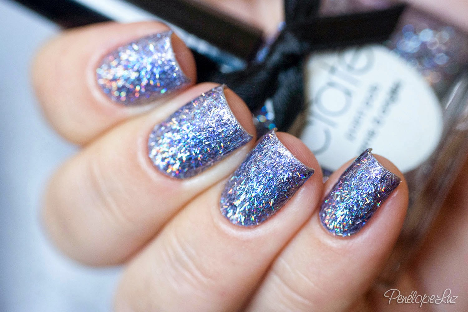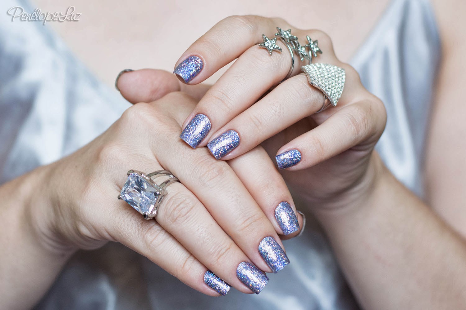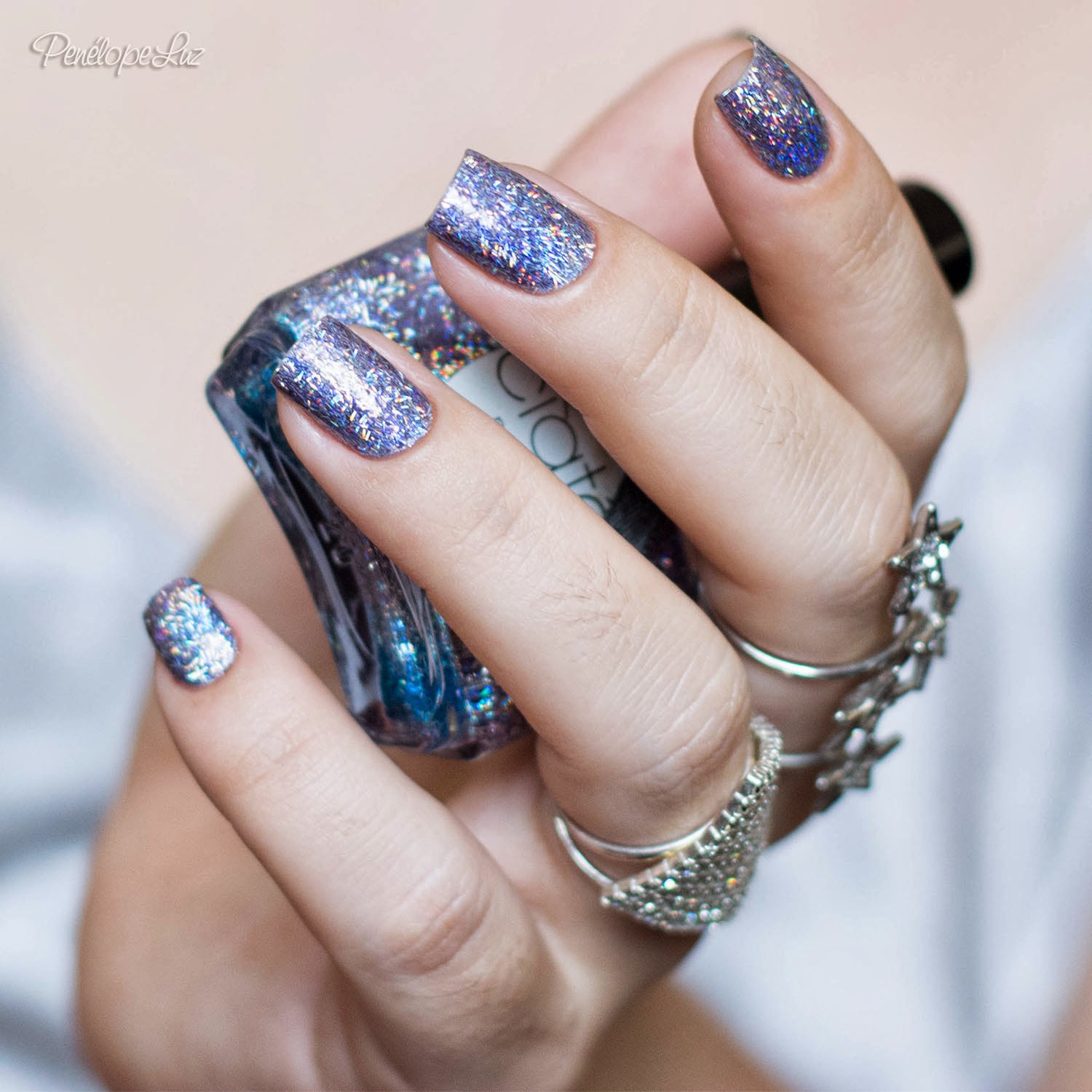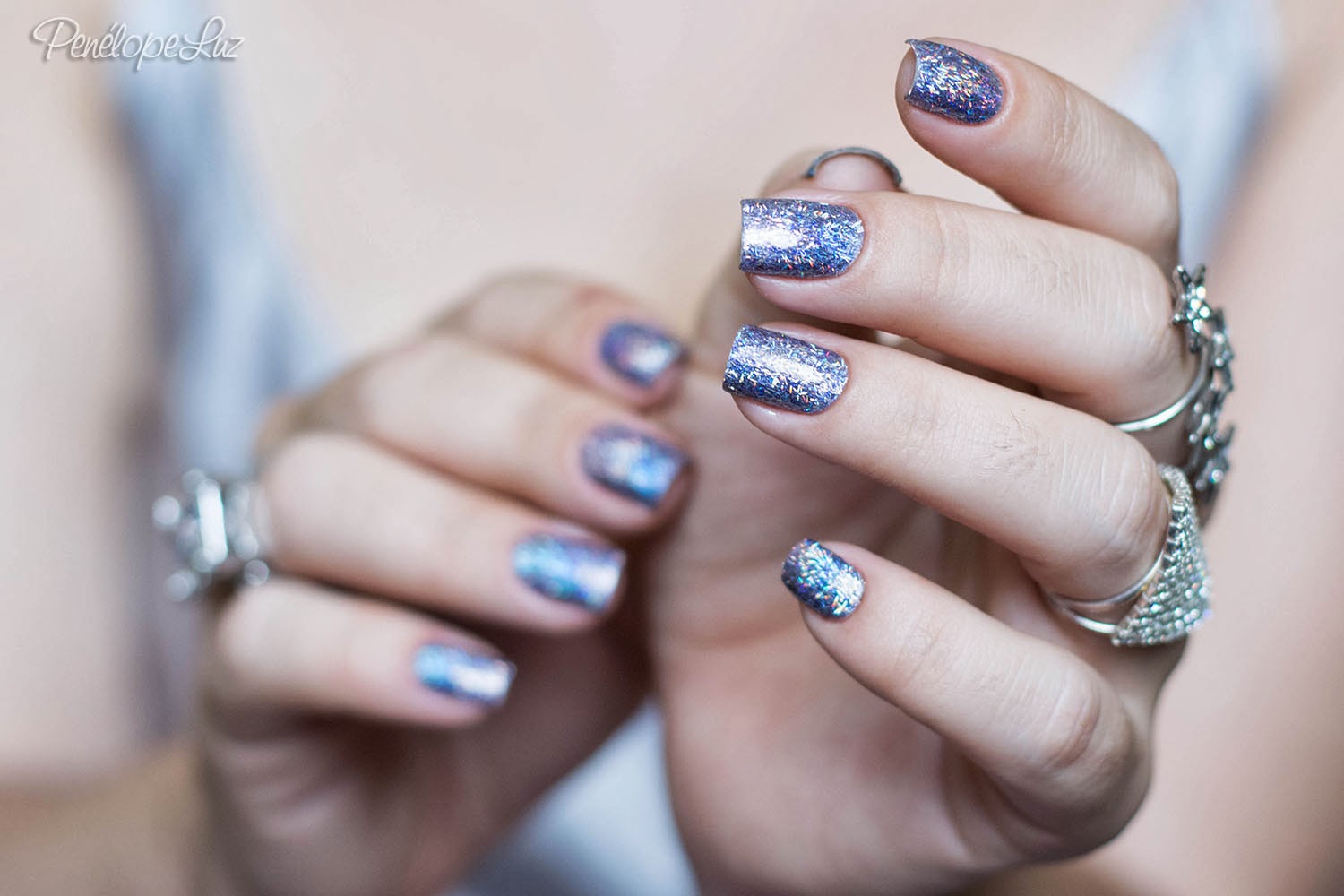 Lindo, lindo, lindo! Ele é composto por micro glitters no formato de slices e tem uma base jelly levemente azulada. Queria bastante preenchido, então coloquei 3 camadas sobre uma de um prata para carimbo, só queria que tudo estivesse preenchido, o esmalte de baixo nem aparece).