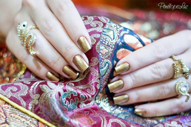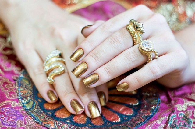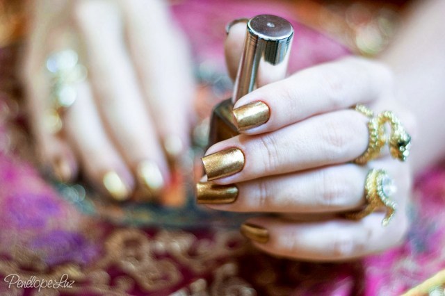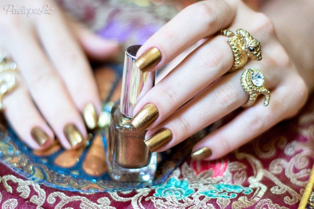 Ele não é tão bem pigmentado, então precisou de 3 camadas pra ficar perfeitinho, e uma coisa que não gostei muito é que demorou demais para secar. Não coloquei top coat porque fiquei com medo de encolher, então eu pude ver a secagem real dele e deixou muito a desejar. HORAS depois ainda não estava seco e até borrou! E pior, esmaltei com ele à tarde, e **no dia seguinte** pela manhã, quando eu colei o durex para fazer a tape mani, ele saiu todo no durex! Na próxima vez que eu usar, vou arriscar o top coat da Impala que até agora nunca encolheu os esmaltes. Veremos se com top coat ele seca, espero que sim, porque ele é lindíssimo, arrisco até a dizer que é o dourado mais lindo da minha coleção!