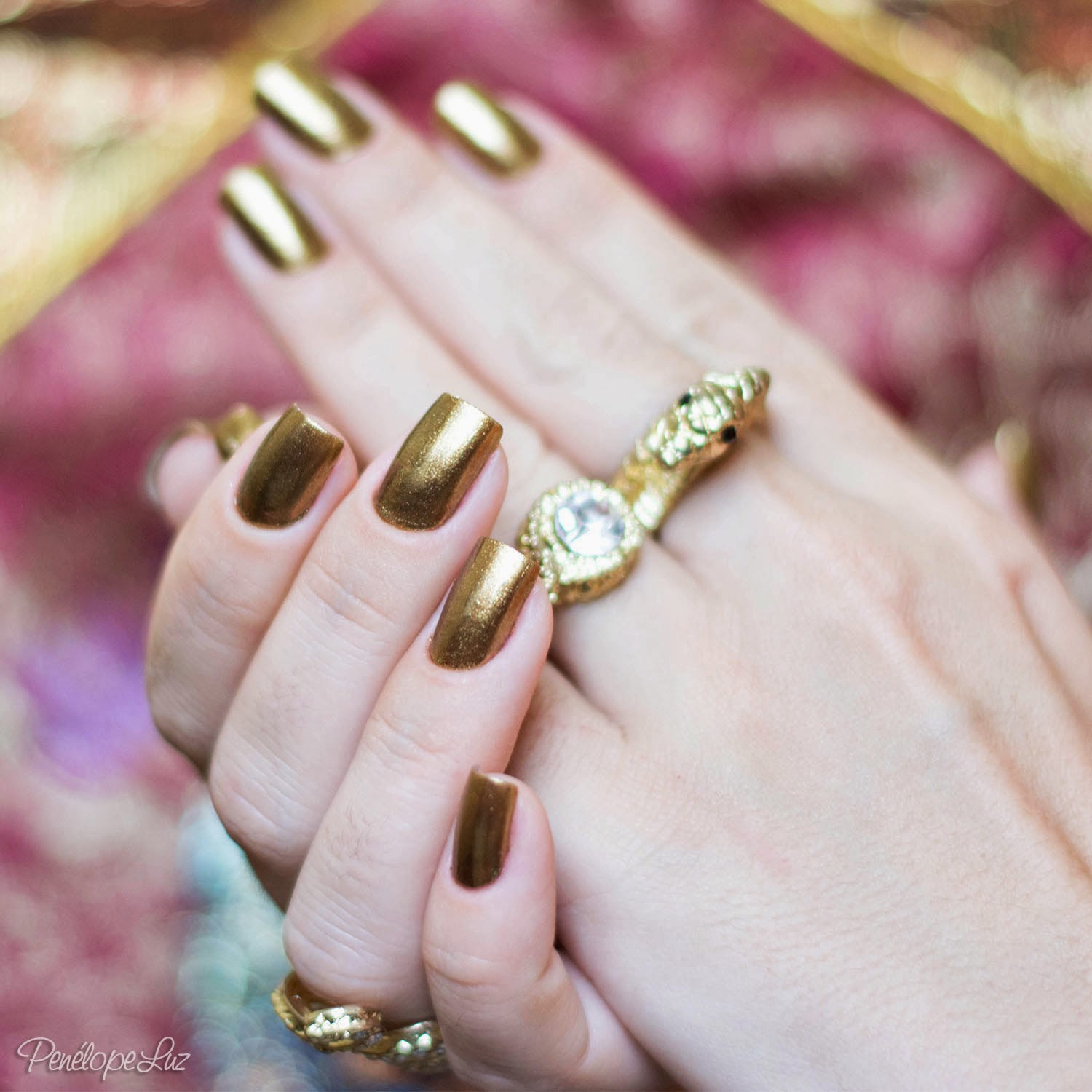 Ele não é tão bem pigmentado, então precisou de 3 camadas pra ficar perfeitinho, e uma coisa que não gostei muito é que demorou demais para secar. Não coloquei top coat porque fiquei com medo de encolher, então eu pude ver a secagem real dele e deixou muito a desejar. HORAS depois ainda não estava seco e até borrou! E pior, esmaltei com ele à tarde, e **no dia seguinte** pela manhã, quando eu colei o durex para fazer a tape mani, ele saiu todo no durex! Na próxima vez que eu usar, vou arriscar o top coat da Impala que até agora nunca encolheu os esmaltes. Veremos se com top coat ele seca, espero que sim, porque ele é lindíssimo, arrisco até a dizer que é o dourado mais lindo da minha coleção!