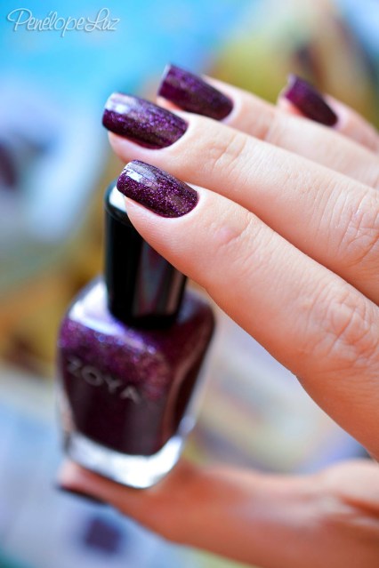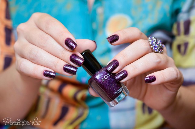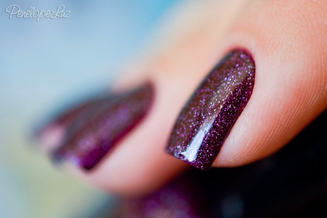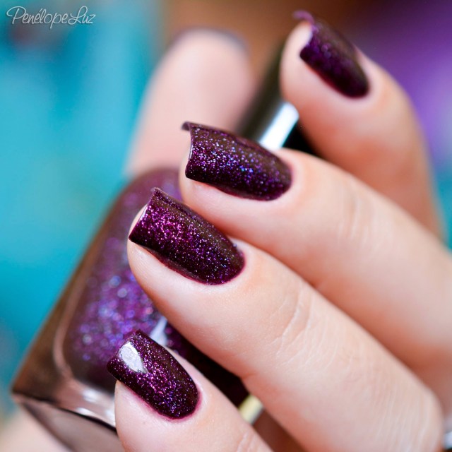 Sou apaixonada por esmaltes desse acabamento, que tem esses micro flocos holográficos, que não formam aquele prisma, mas dão um efeito lindíssimo que lembra o glitter! E essa cor do Payton é linda, um tom berinjela puxando pro vinho, super elegante!