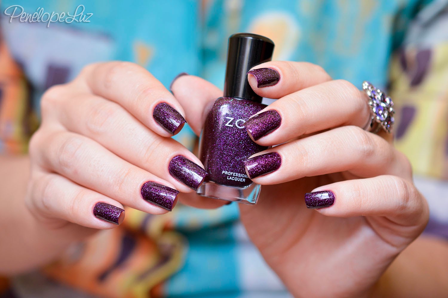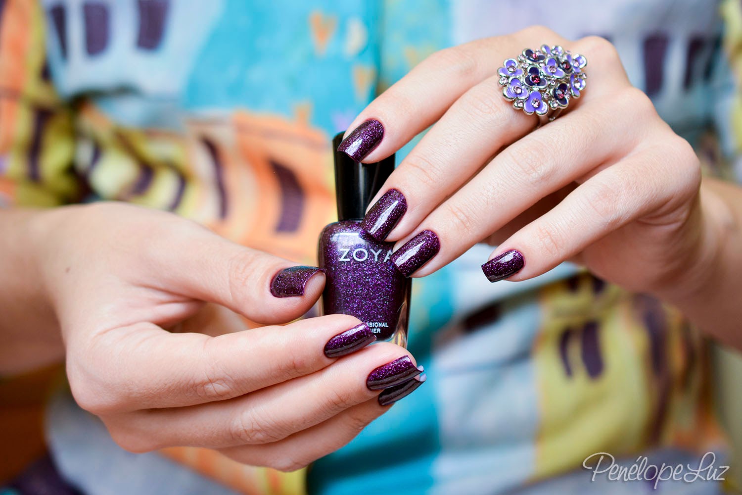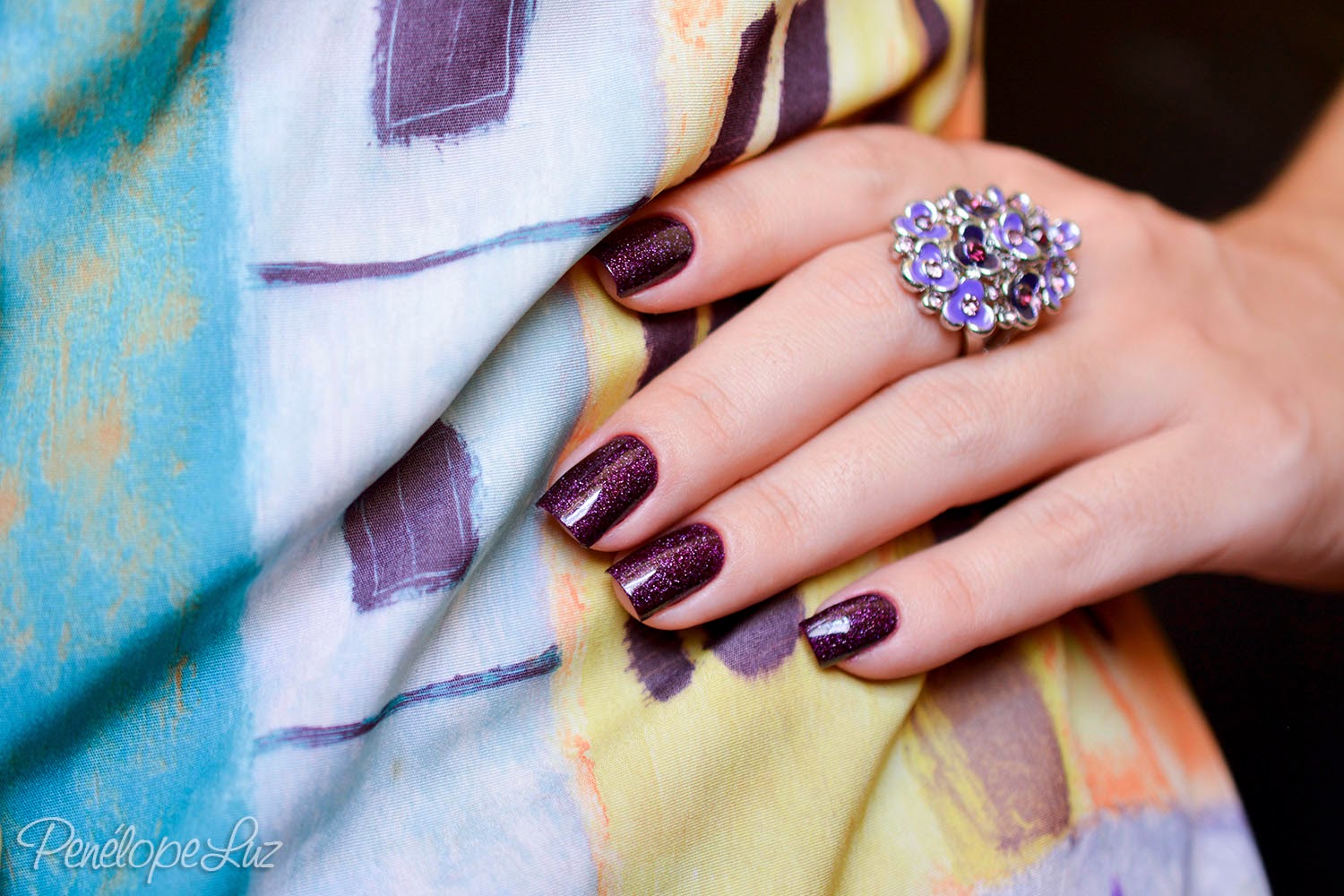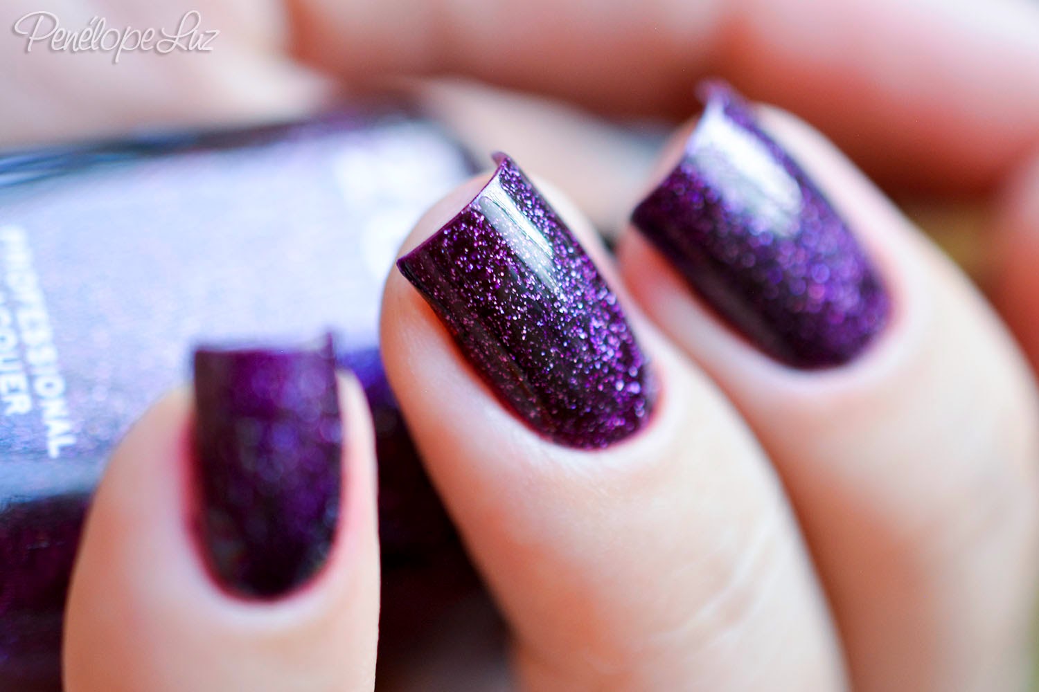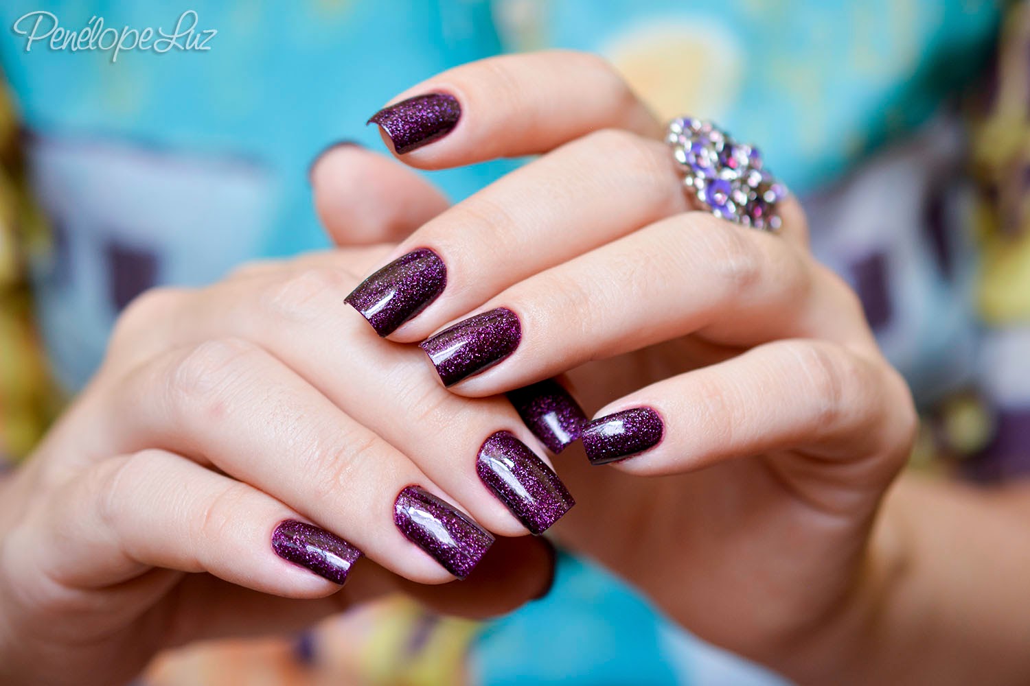 Sou apaixonada por esmaltes desse acabamento, que tem esses micro flocos holográficos, que não formam aquele prisma, mas dão um efeito lindíssimo que lembra o glitter! E essa cor do Payton é linda, um tom berinjela puxando pro vinho, super elegante!