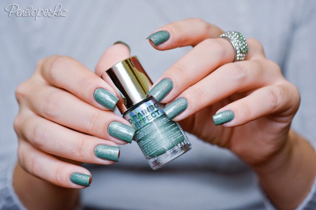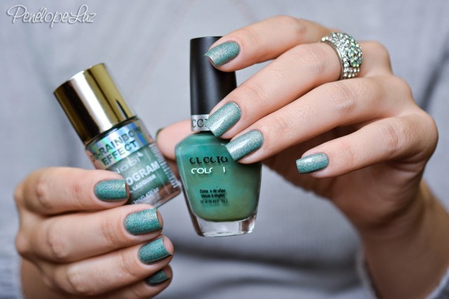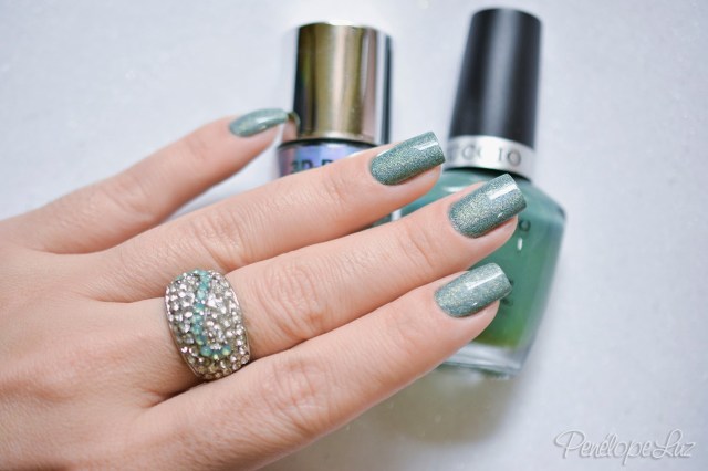 Eu queria usar o Nabi sozinho, mas ele é “infinitamente” ralo, e detesto esmalte assim – quem gosta? Ninguém, né? – Só que apesar desse defeito, ele tem aquela holografia discreta e linda, que dá profundidade a qualquer esmaltação! Pensei então que teria que combiná-lo com outro e fui procurando verdes na minha coleção, até que experimentei com o Cuccio e ficou perfeito! O Cuccio é muito pigmentado, então coloquei uma camada dele e 2 do Nabi. Para vocês verem melhor, vejam como duas camadas do Nabi fica muito ralo! Para cobrir só com umas 5 camadas ou mais.